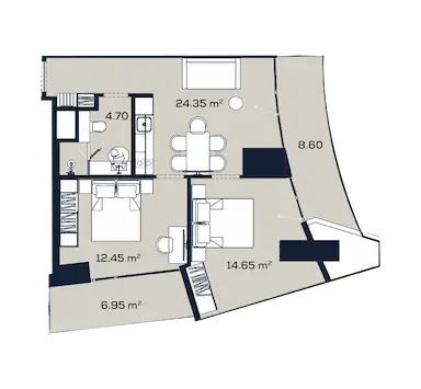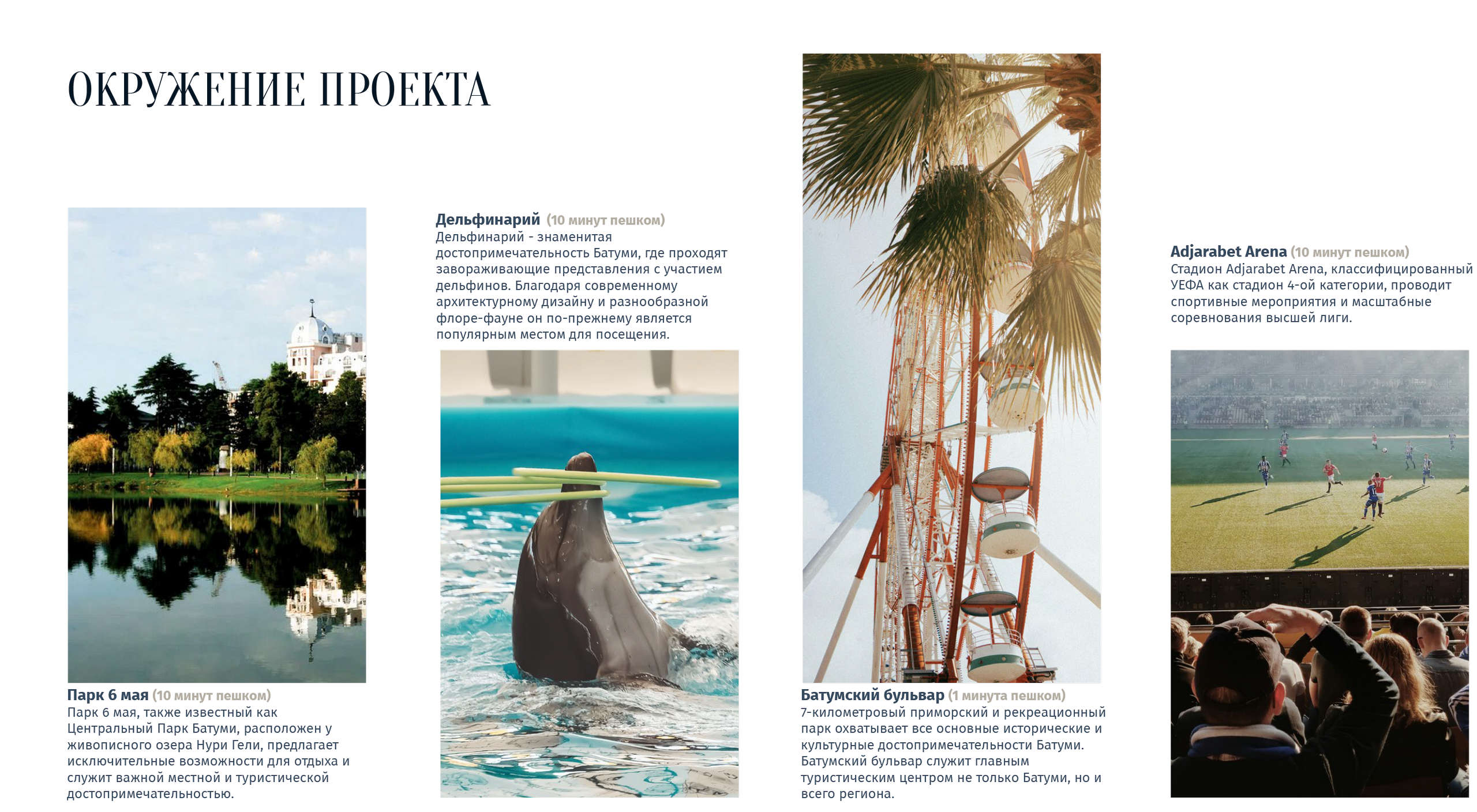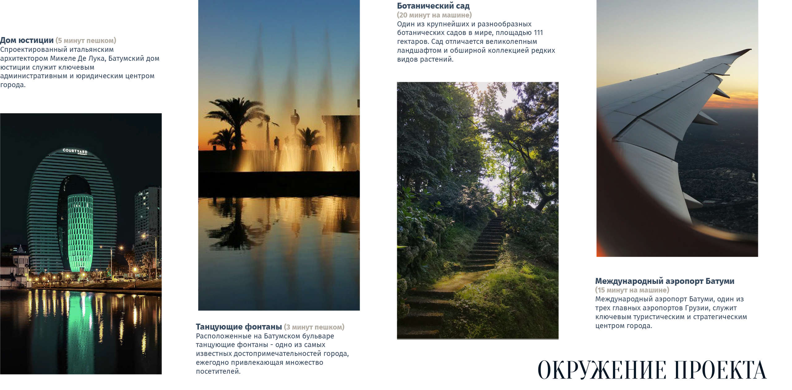 Каждая квартира спроектирована с панорамными окнами и видами на море, город и Батумский бульвар. Инфраструктура включает бассейн, SPA-центр, фитнес, рестораны, лаундж-зоны, кинотеатр, боулинг и казино.