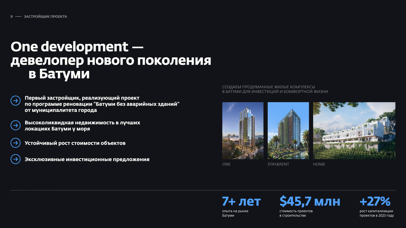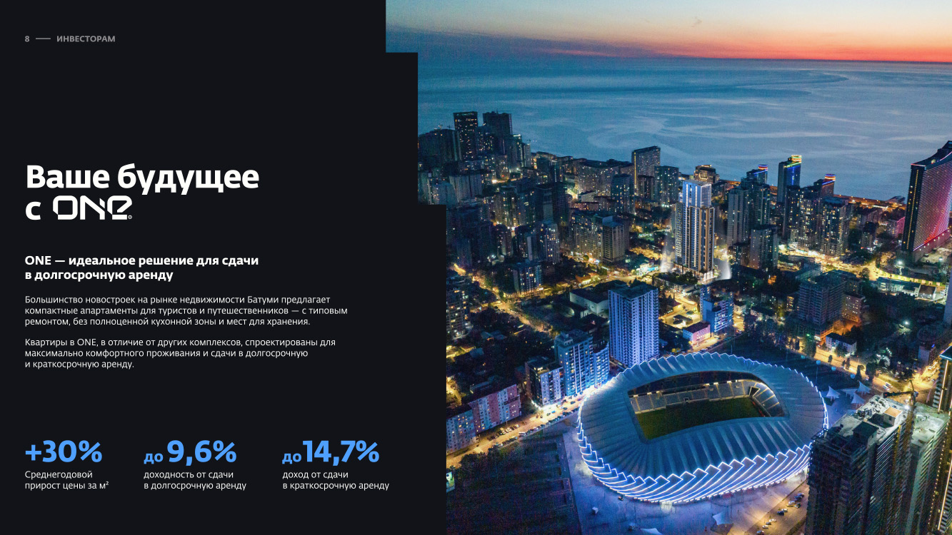 One — современный жилой комплекс в самом сердце Батуми, который объединяет стильную архитектуру, комфорт городской жизни и возможности для выгодной инвестиции.