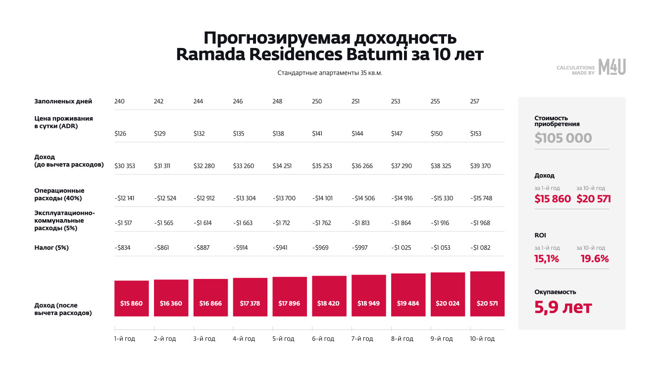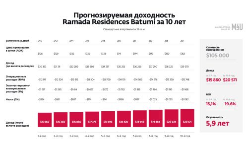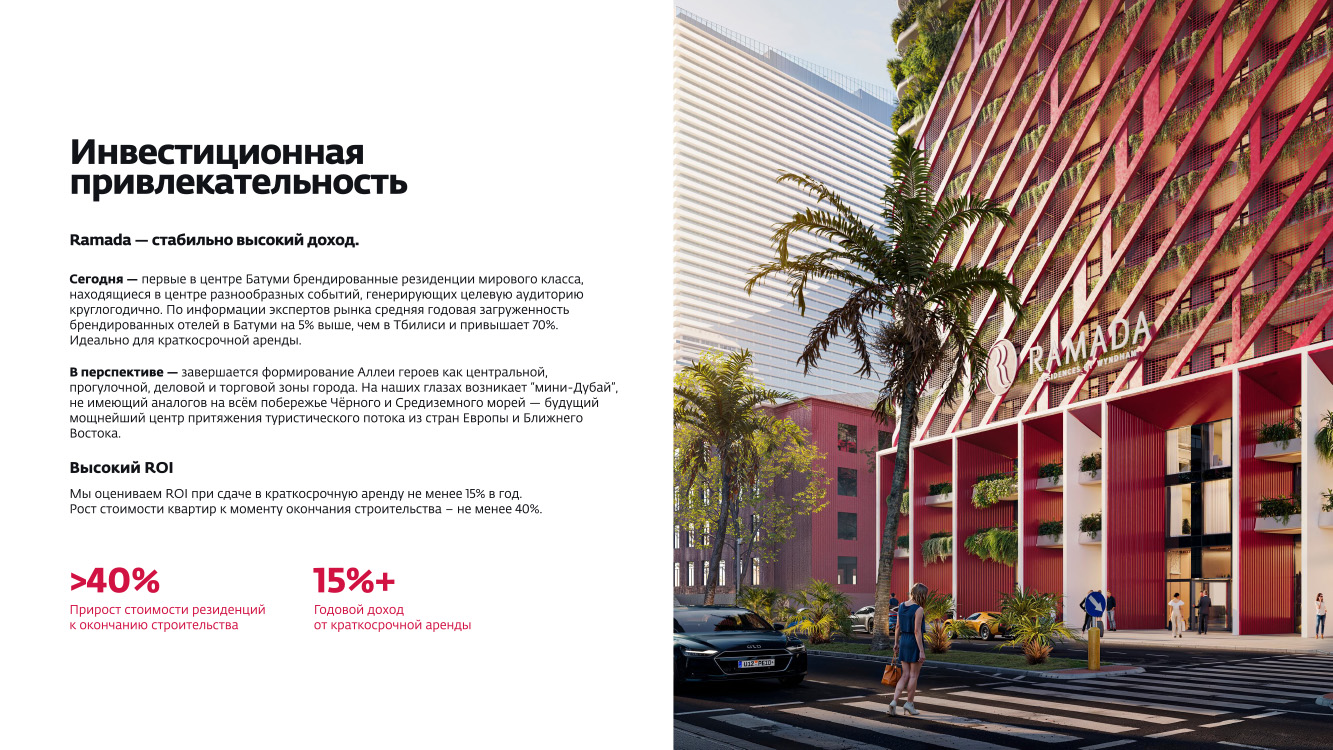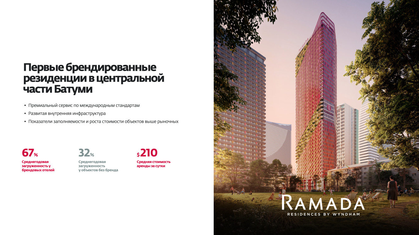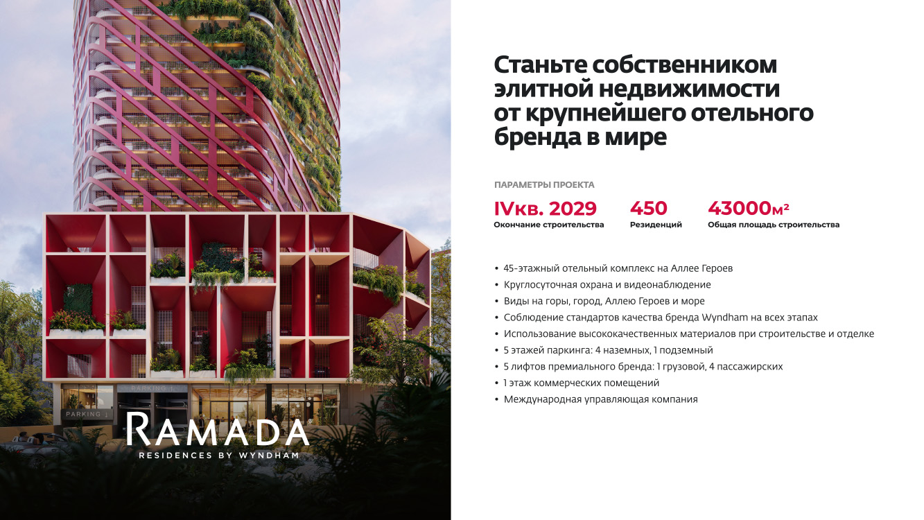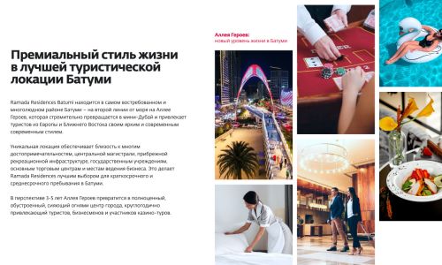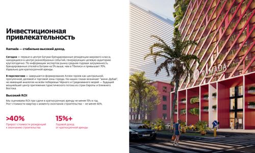 Проект Ramada — это уникальная возможность приобрести апартаменты в Батуми под управлением известного международного бренда. Современное строительство, премиальное расположение у моря, сервис гостиничного уровня и продуманная инфраструктура делают этот проект привлекательным как для проживания, так и для инвестиций.