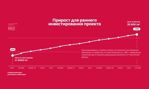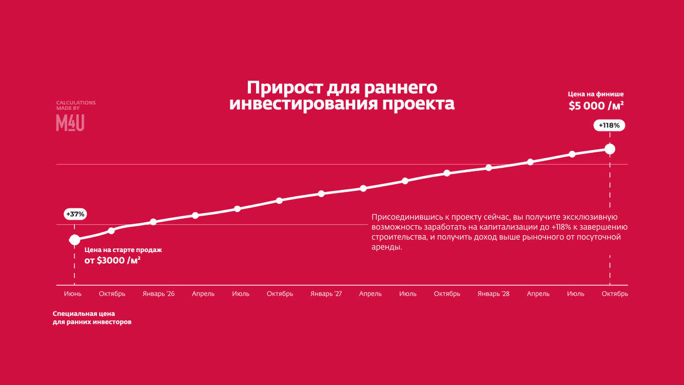 Присоединившись к проекту сейчас, вы получите эксклюзивную возможность заработать на капитализации до +118% к завершению строительства, и получить доход выше рыночного от посуточной аренды.