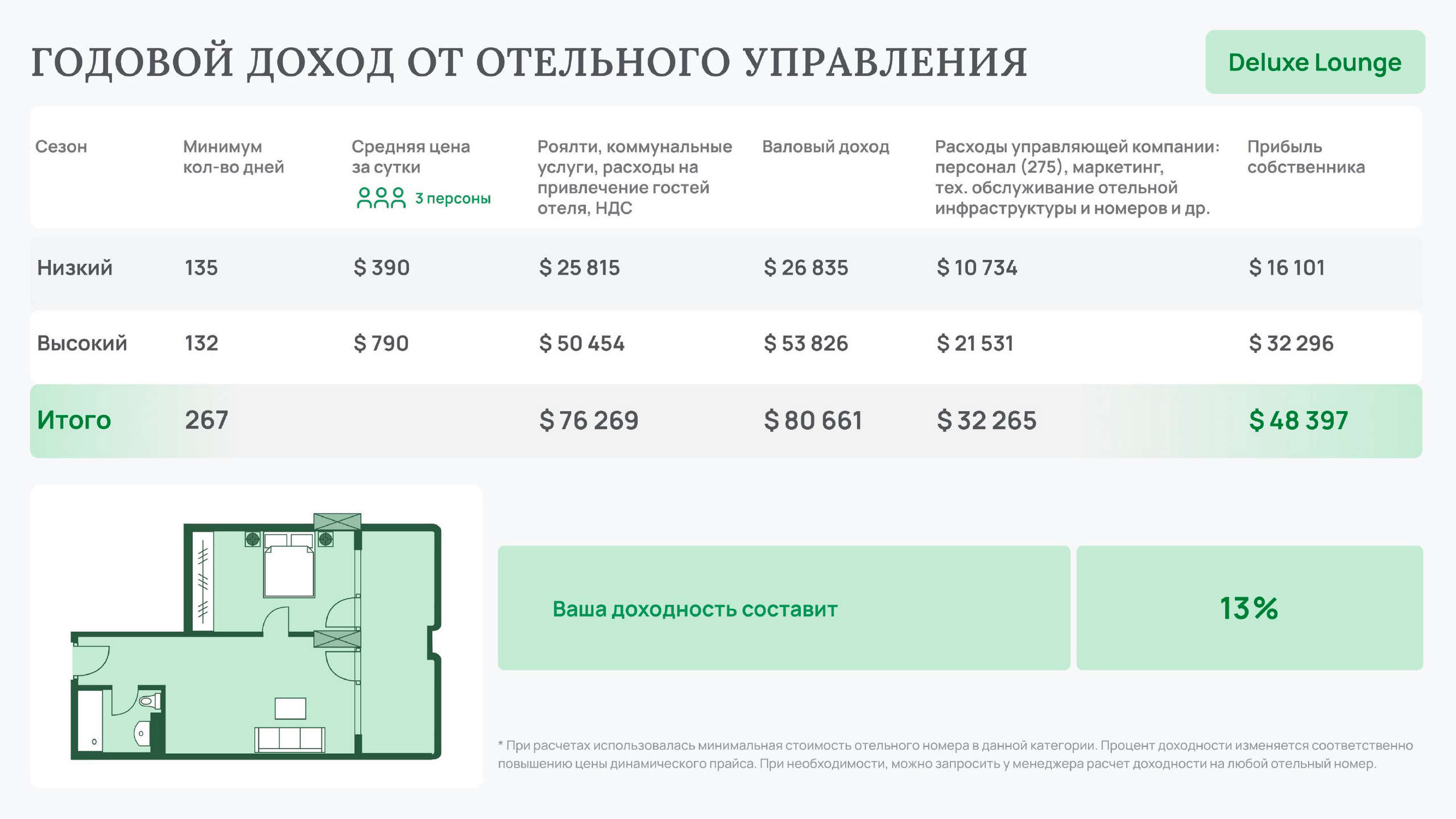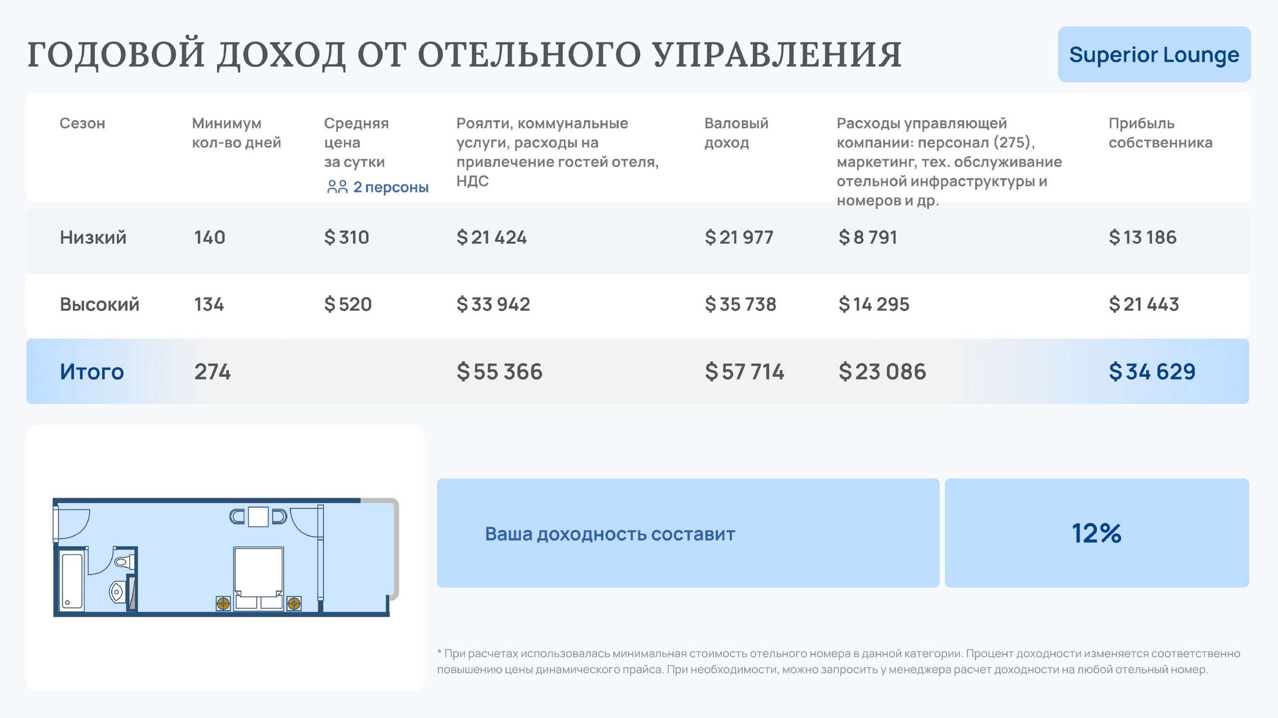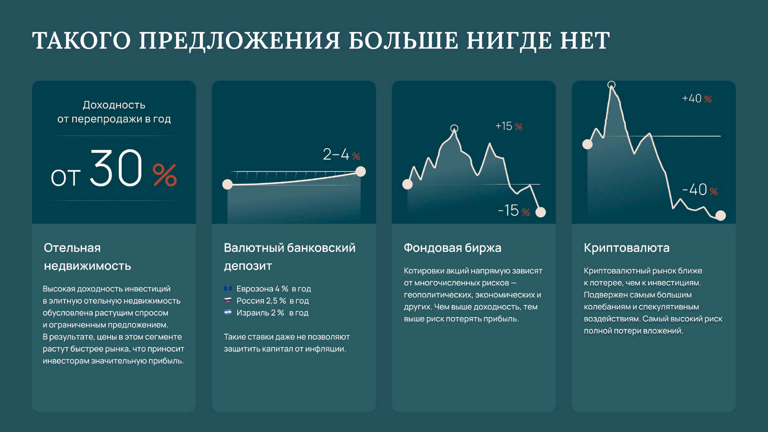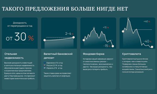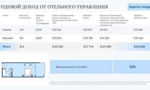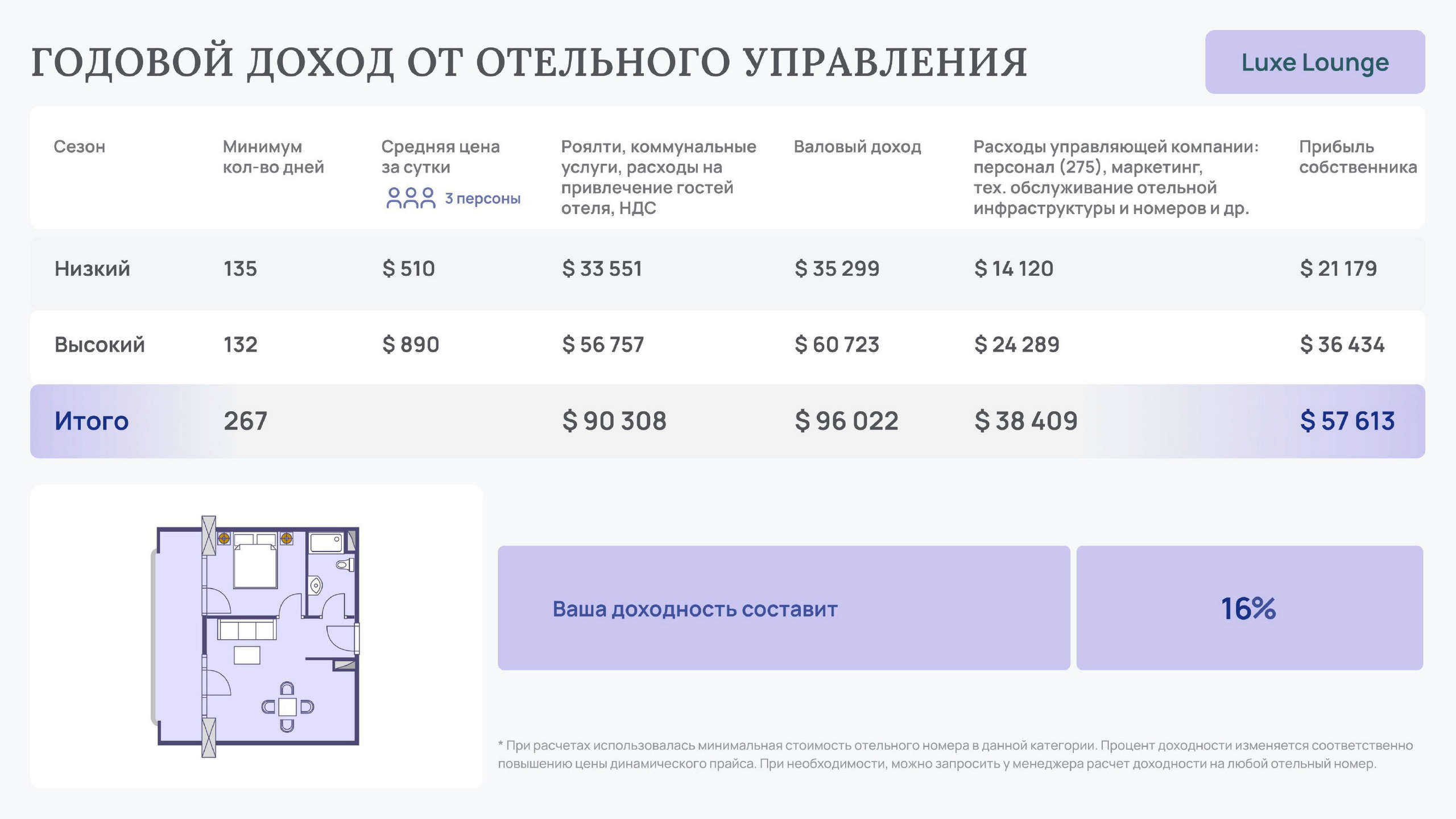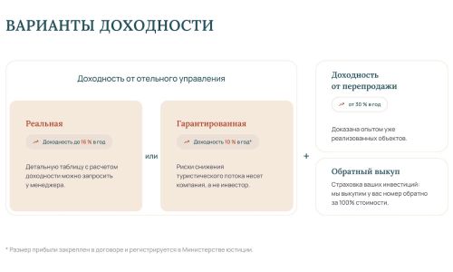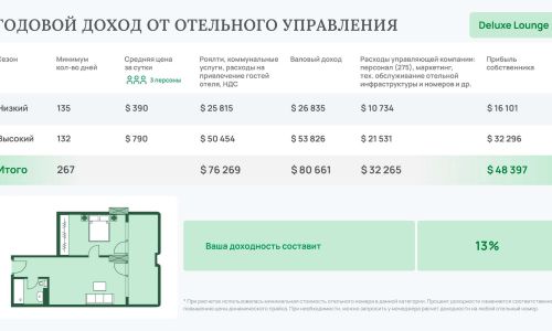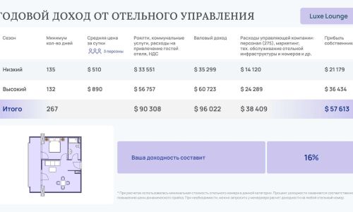 - Доход от управления номером до 16% в год + рост капитала до 30% в год по данным девелопера