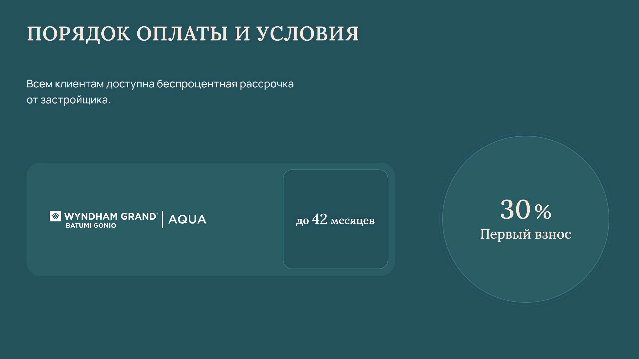 - Рассрочка до 42 месяцев 0% – комфортный вход в проект уровня Wyndham Grand