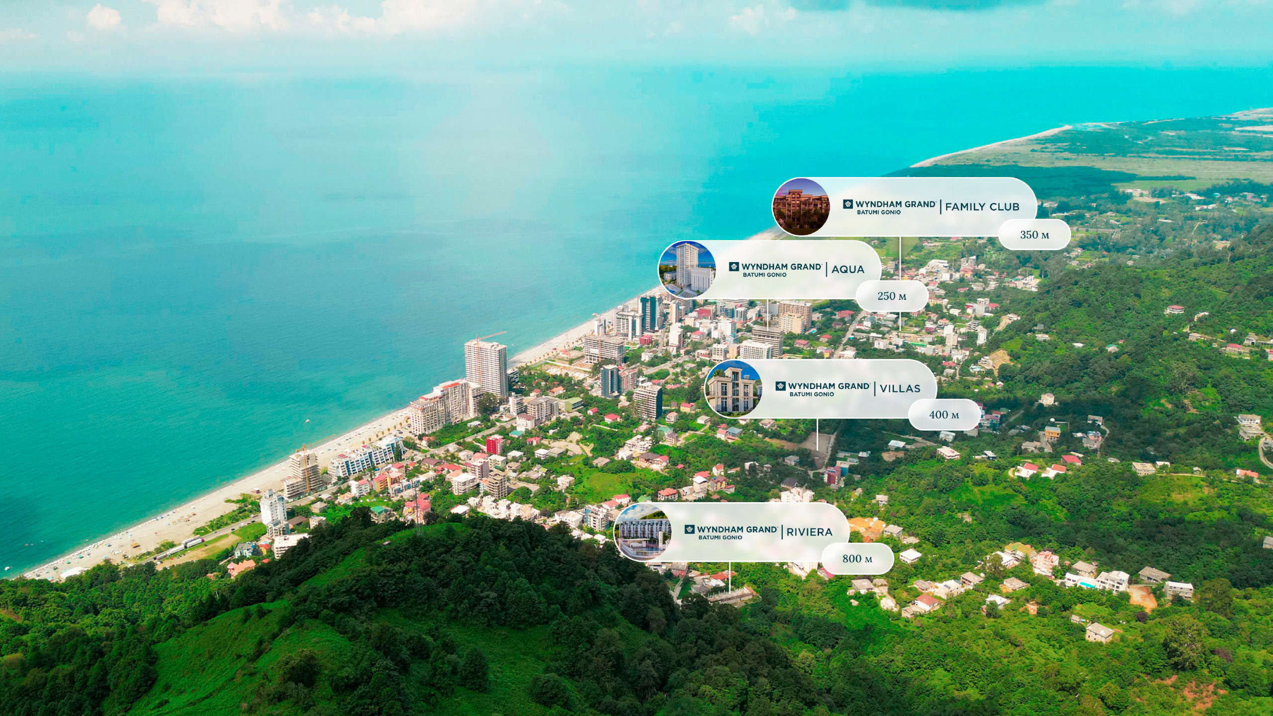 Aqua — часть большого курортного комплекса Wyndham Grand Batumi Gonio, который включает 5 пятизвёздочных отелей с общей инфраструктурой 100+ объектов на площади более 27 000 м².