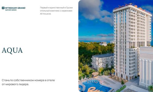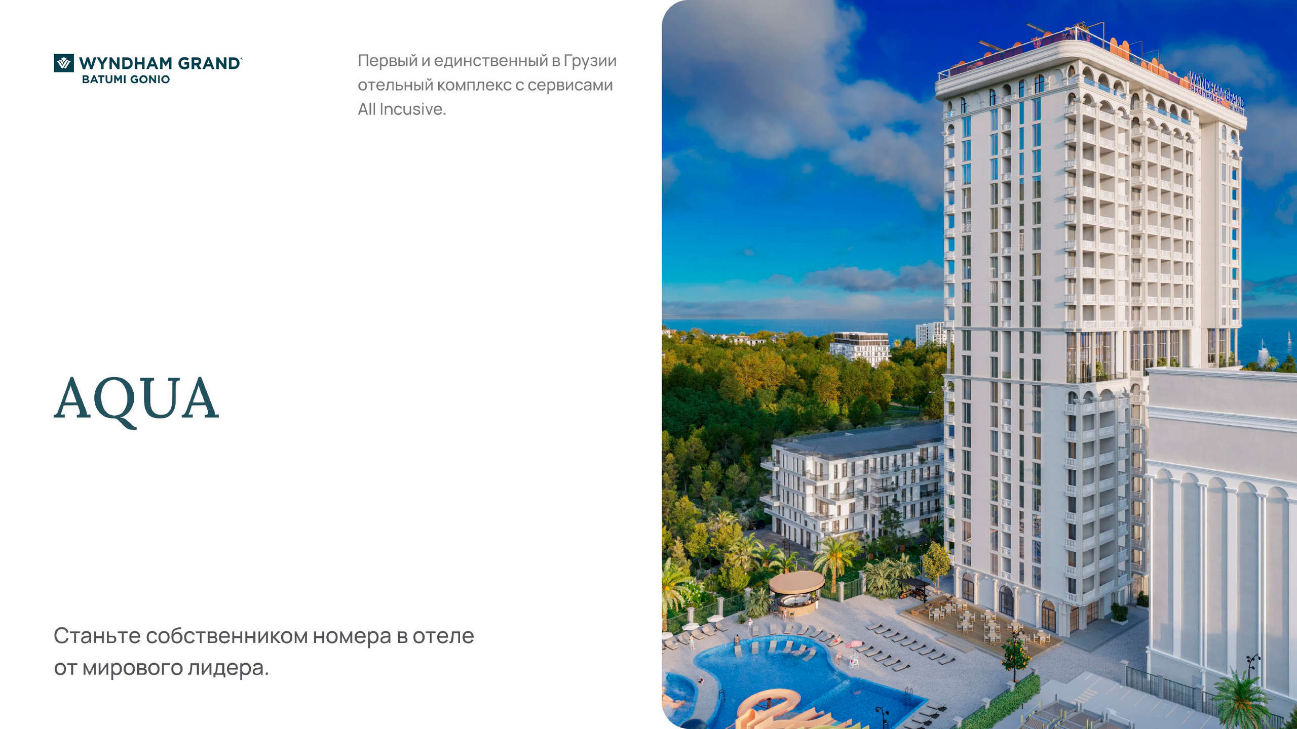 Aqua входит в первую в Грузии курортную концепцию All Inclusive класса Wyndham Grand с крупнейшей гостиничной инфраструктурой в стране и отмечен международной наградой Luxury Lifestyle Awards 2025 как один из лучших luxury branded residences-проектов.