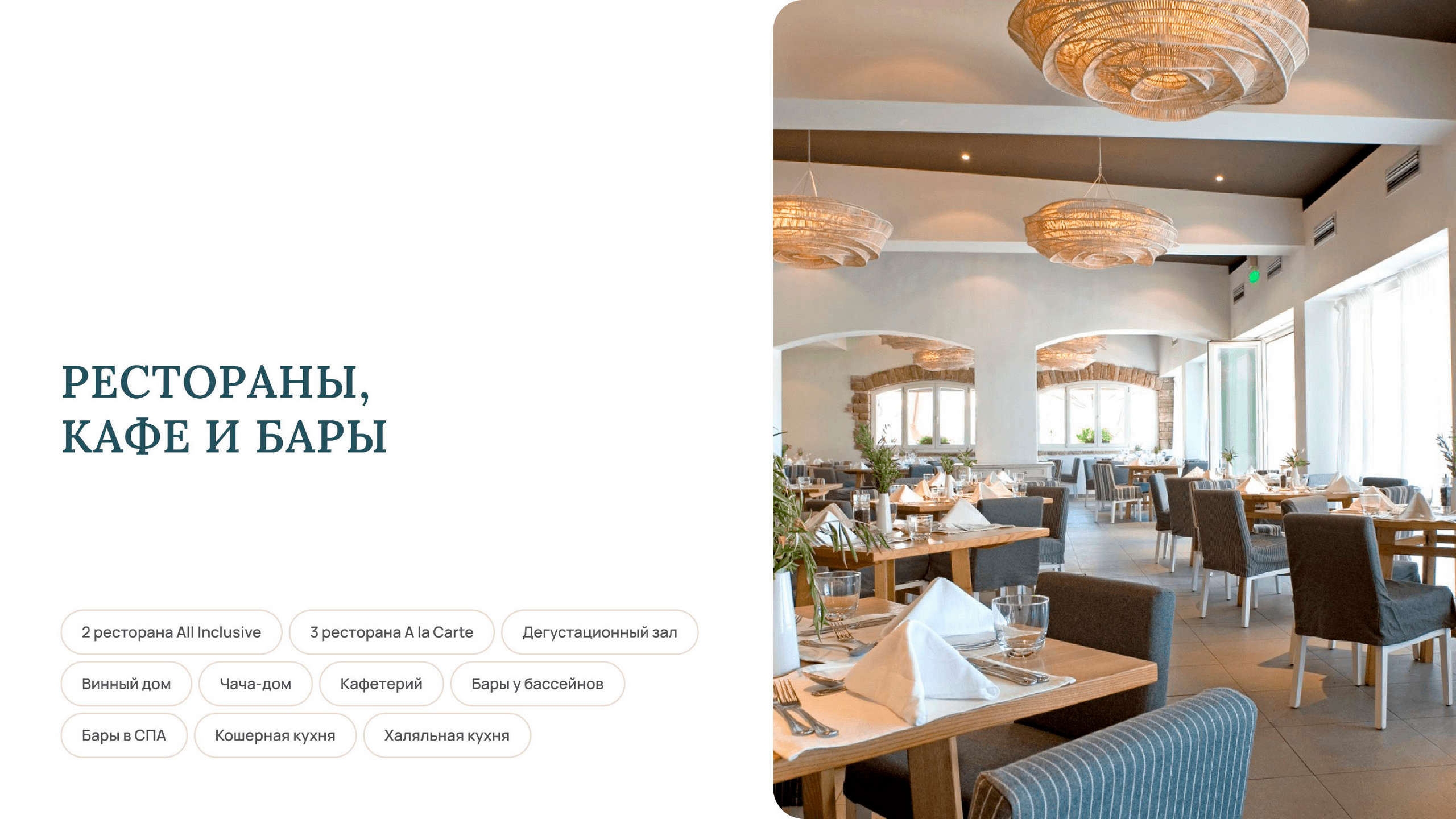 - 12 ресторанов, кафе и баров (All Inclusive и à la carte, винный дом, дегустационные комнаты, бары у бассейна);