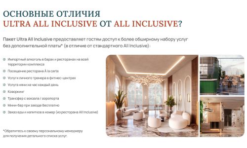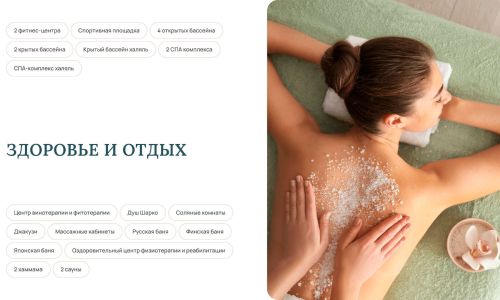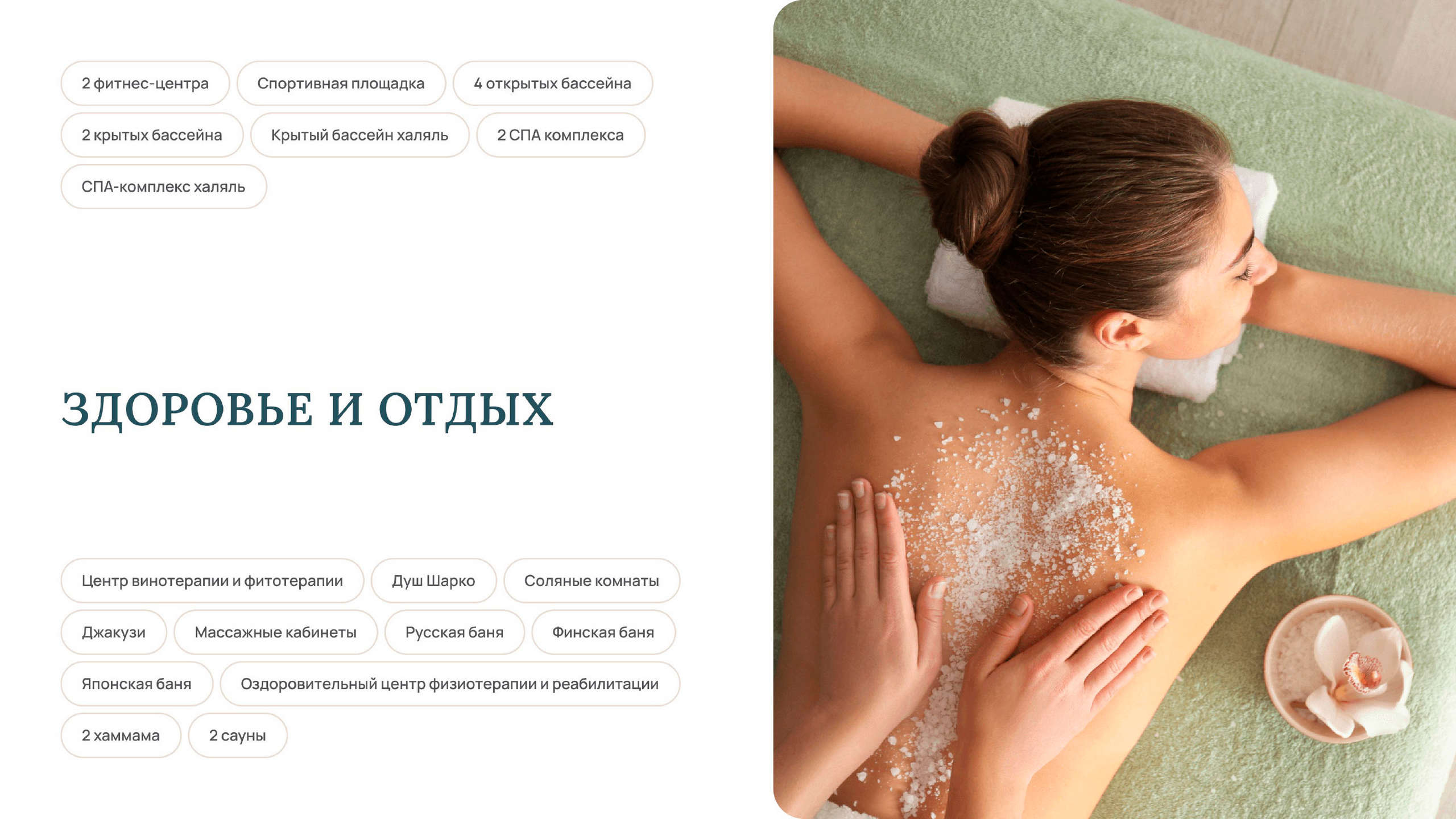 - 3 SPA-комплекса, фитнес-центры, саунный блок, хаммам, массажные и косметологические кабинеты;