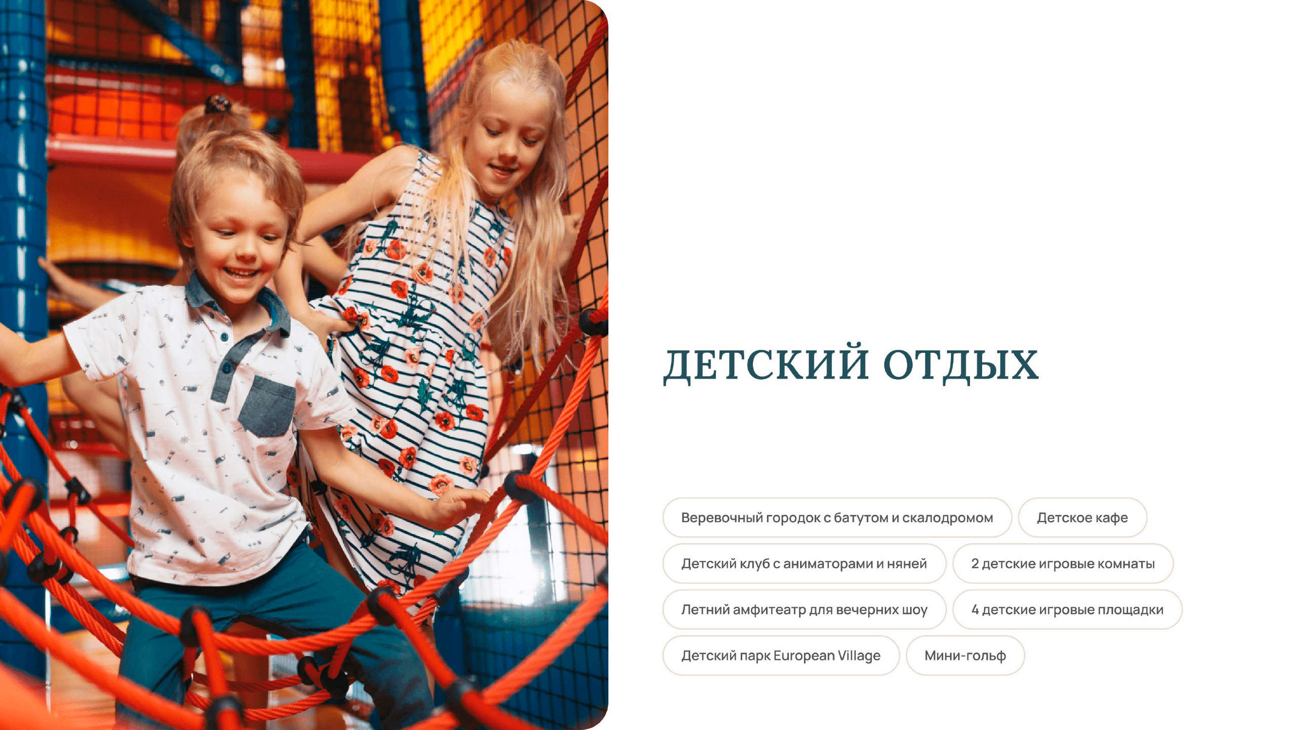 - семьям с детьми — из-за аквапарка, детских клубов и семейной инфраструктуры;