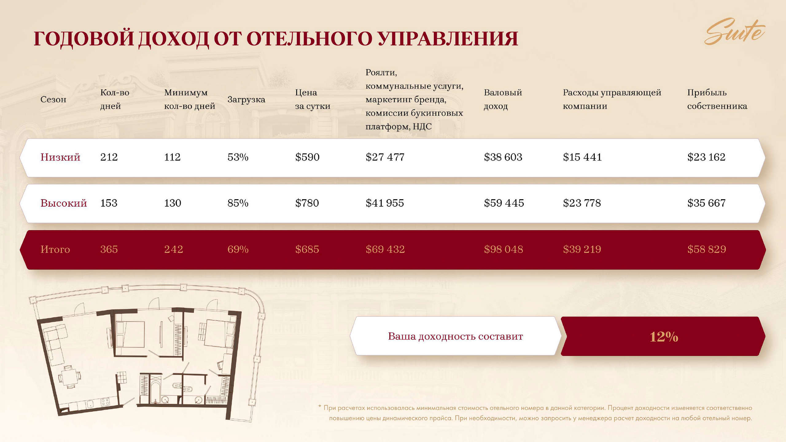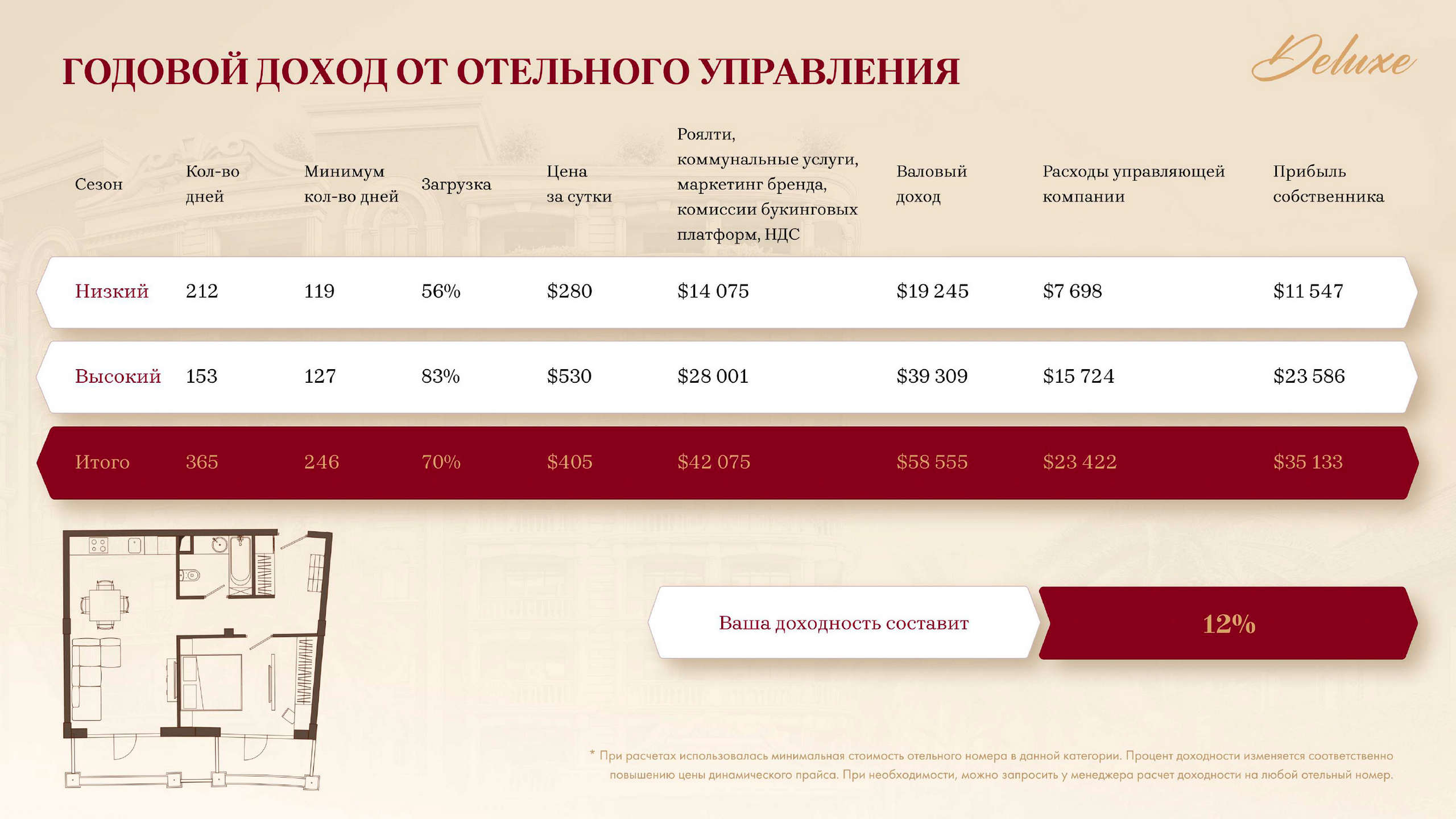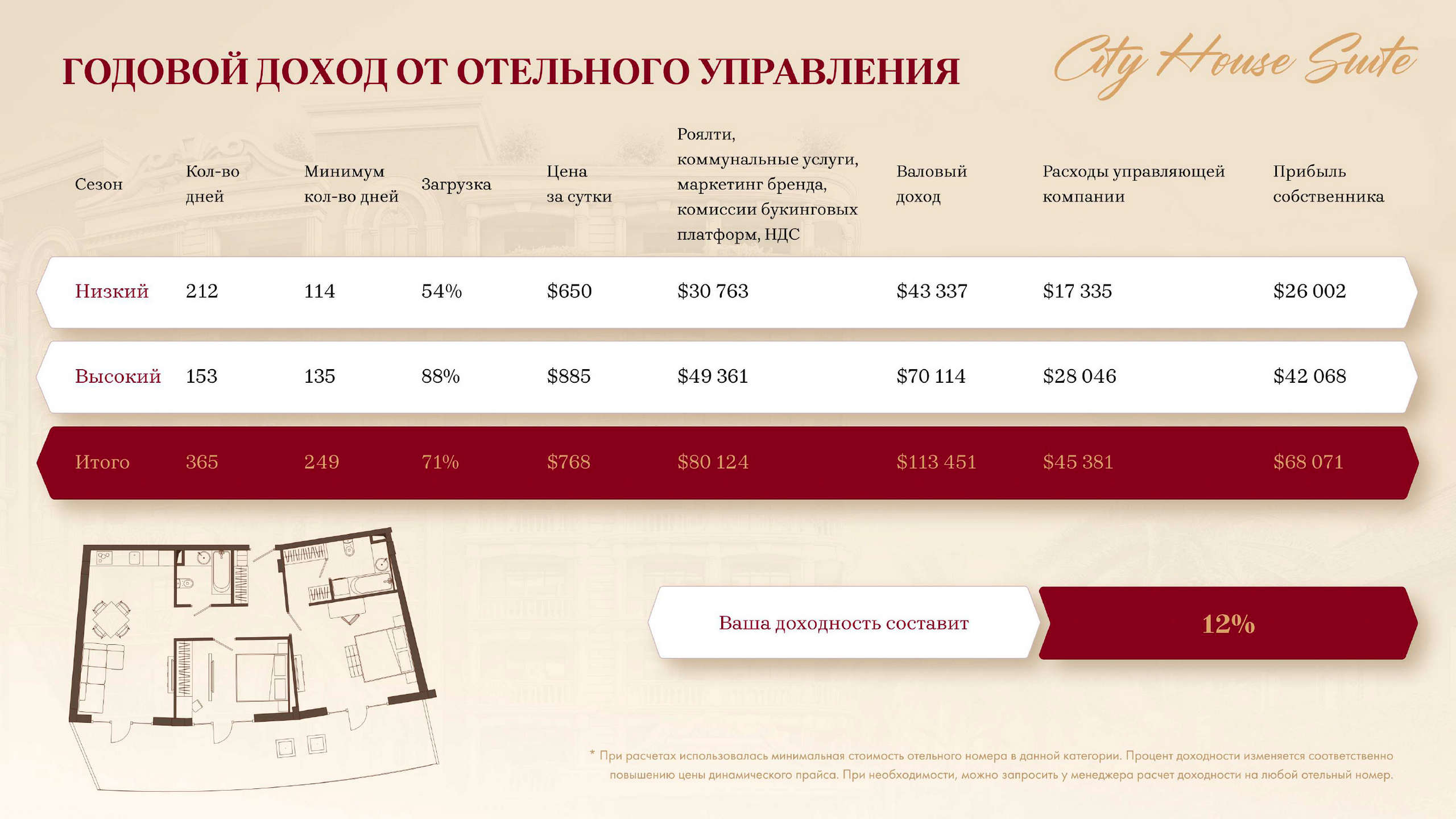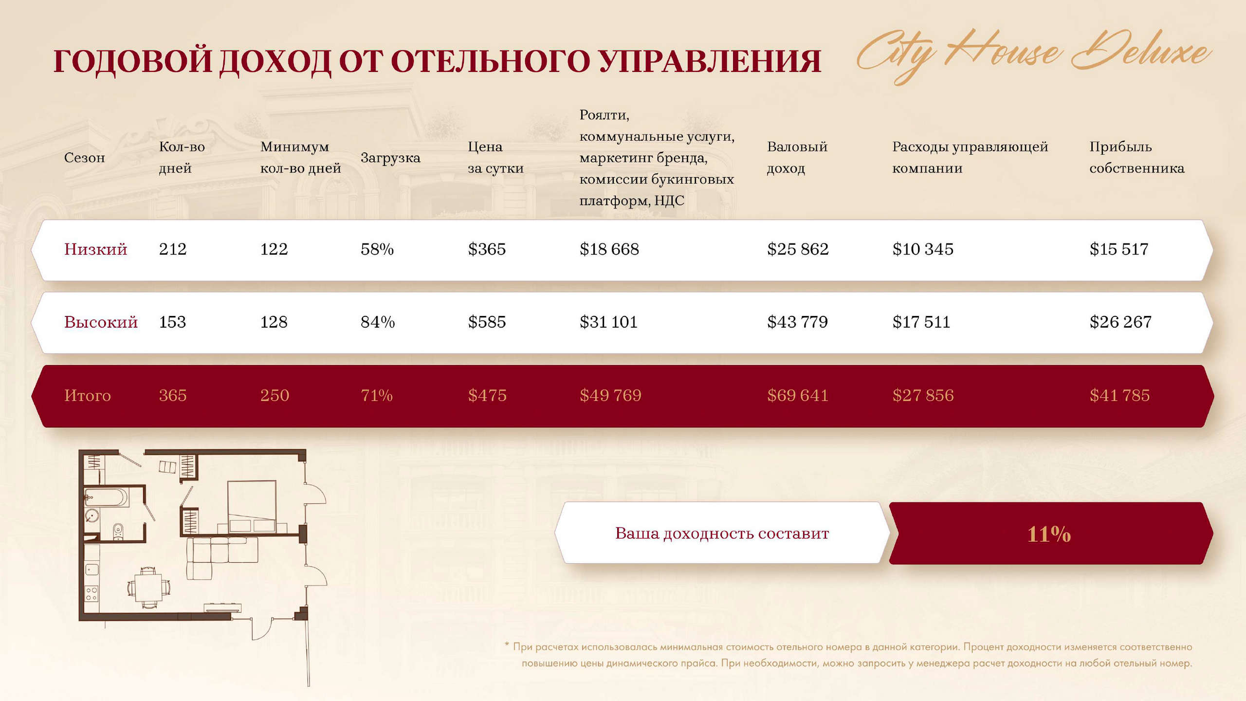 - подобрать оптимальный тип резиденции (Superior, Deluxe, Suite, City House) под цель: доход / отдых / престиж;