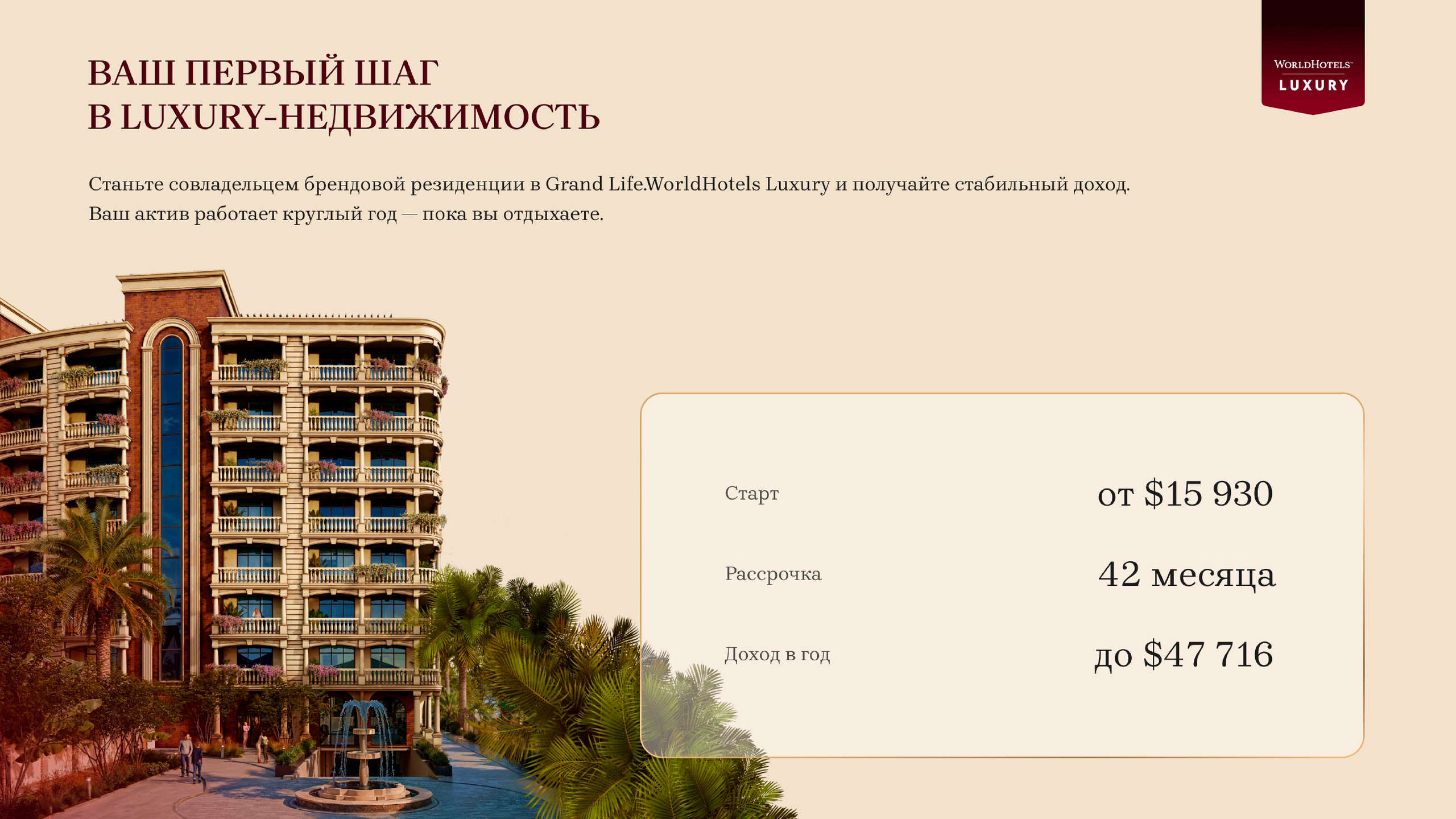 Grand Life — это не просто квартира у моря, а 5★ отельная резиденция под брендом WorldHotels Luxury от European Village. Вход в долларовый доход с управлением международным оператором, доступом к инфраструктуре Wyndham и понятной стратегией выхода из инвестиции.