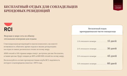 Дополнительный плюс: доход идёт в долларах США, а также собственник получает ** RCІ-обмен, Travel Club и бесплатные проживание в отелях WorldHotels** по программе лояльности.
