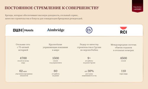 Дополнительно владельцы резиденций получают доступ к 5-отельному комплексу Wyndham Grand Batumi Gonio с более чем 100 объектами инфраструктуры на 27 000+ м²: аква-зона, бассейны, рестораны, детские клубы, spa, спорт и многое другое — в формате Ultra All Inclusive.