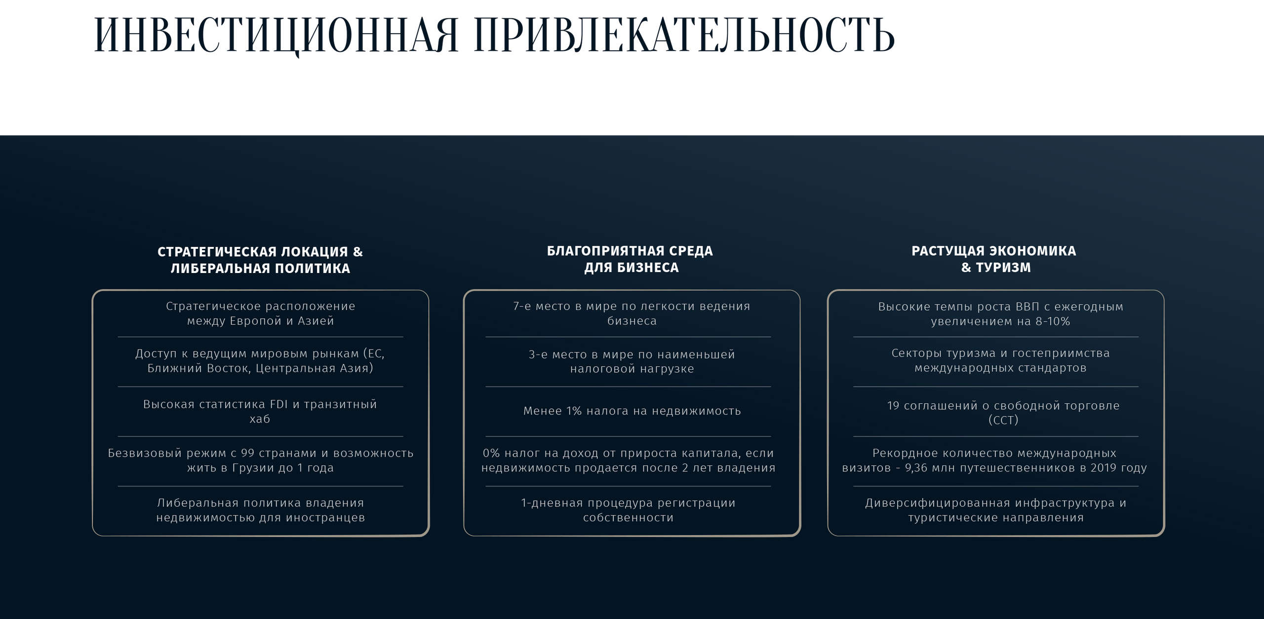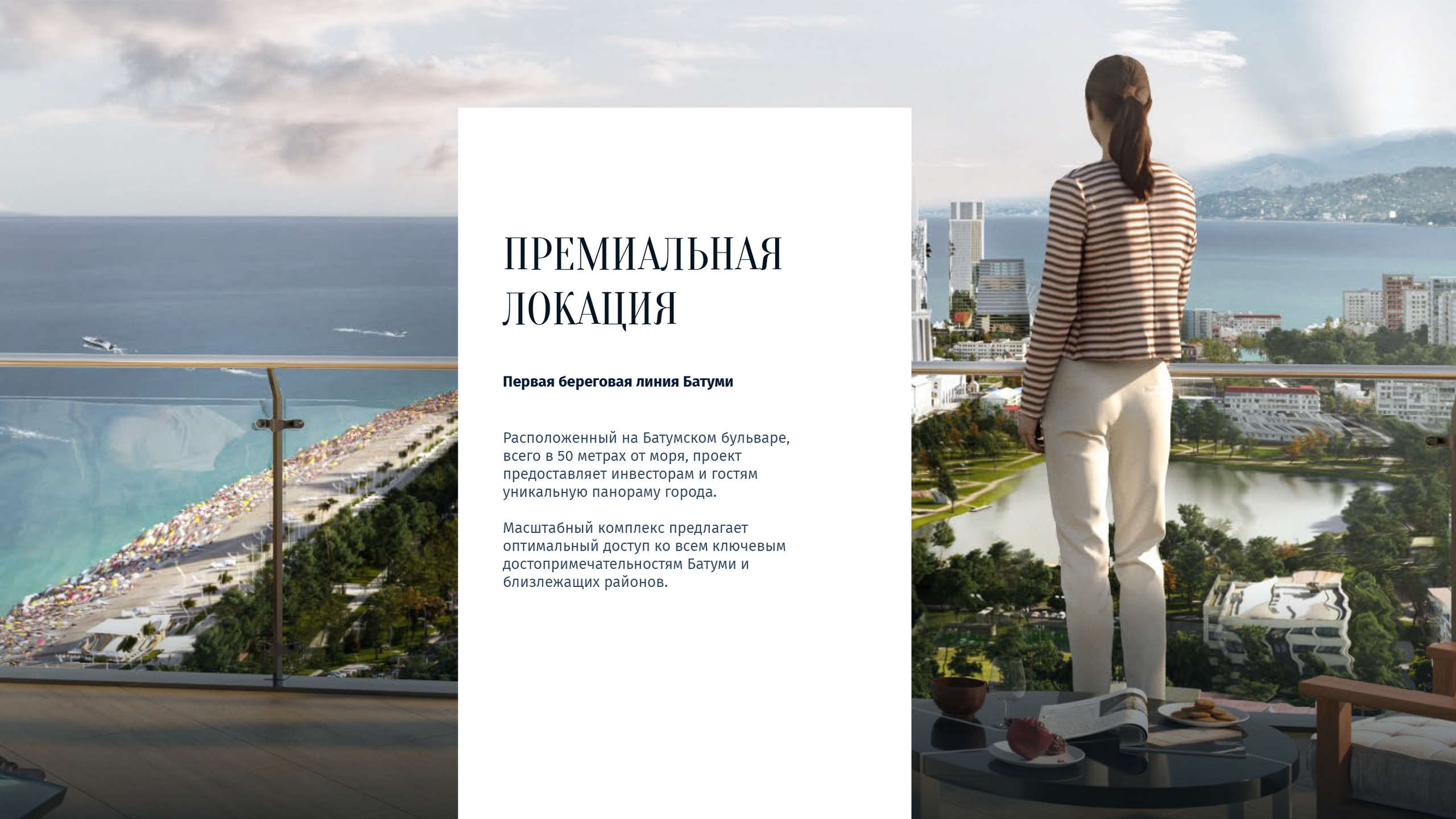 Каждая квартира спроектирована с панорамными окнами и видами на море, город и Батумский бульвар. Инфраструктура включает бассейн, SPA-центр, фитнес, рестораны, лаундж-зоны, кинотеатр, боулинг и казино.