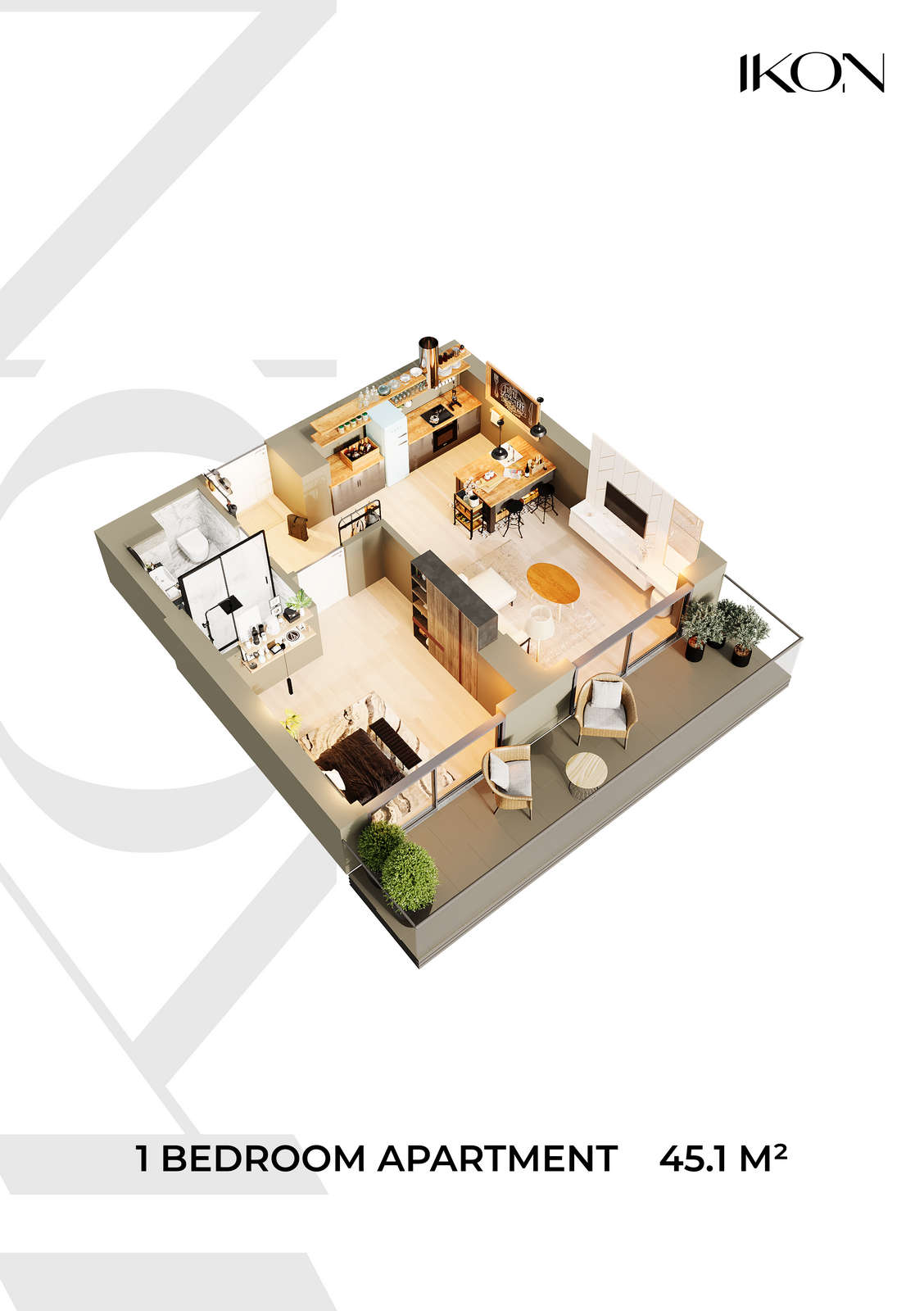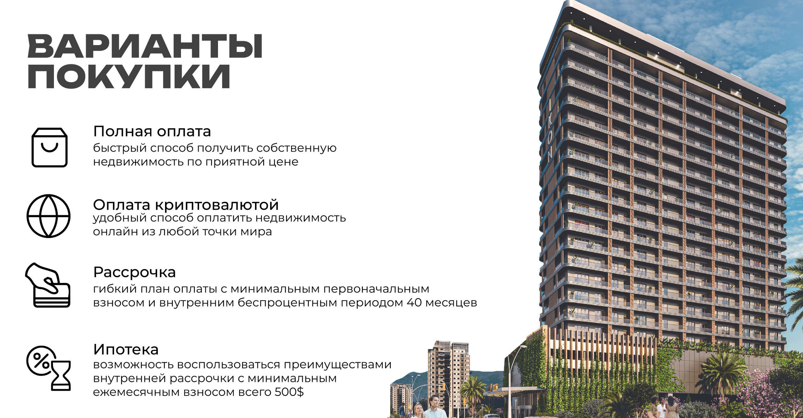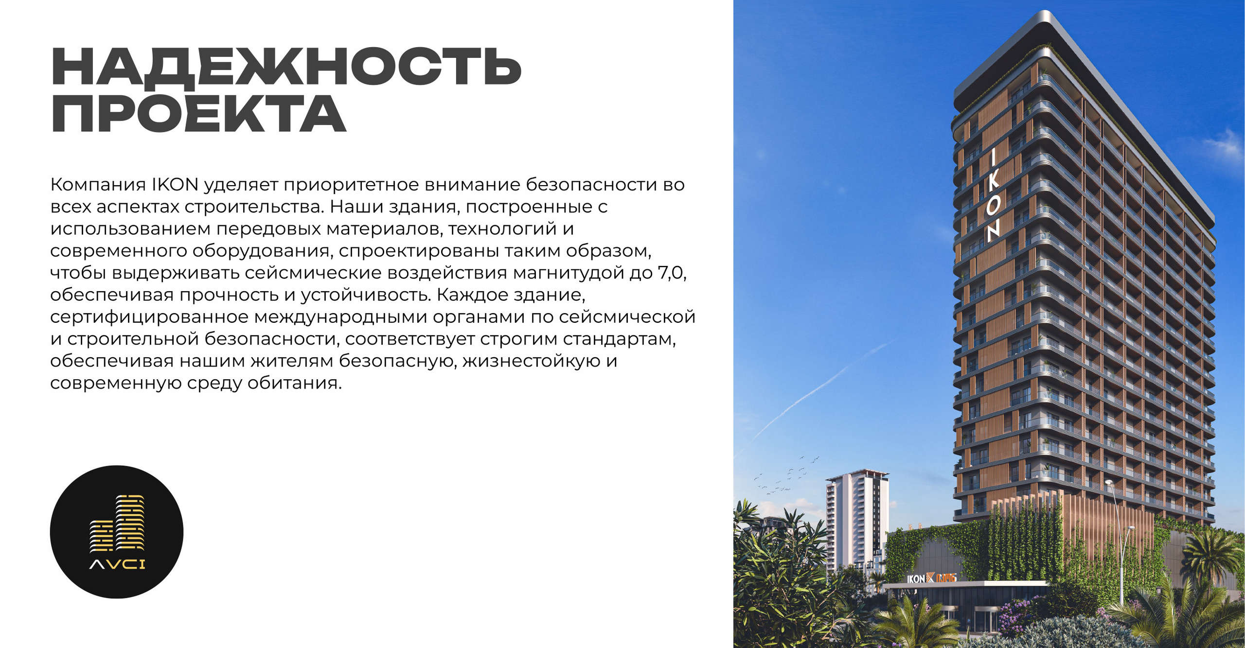 IKON — это 21-этажный премиум-комплекс в динамичном районе New Boulevard, всего ~350 м от пляжа. Панорамные окна, балконы, 3-метровые потолки и продуманные планировки делают его удобным и для жизни, и для доходной аренды. Вы входите в проект на стадии строительства и забираете рост цены к 2027 году.