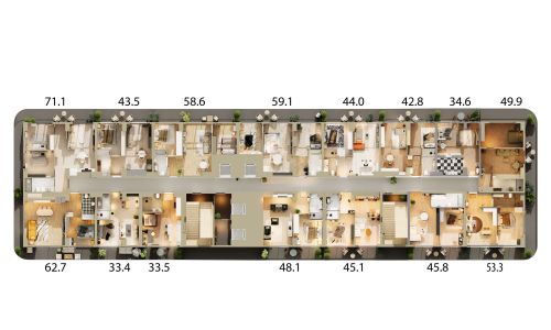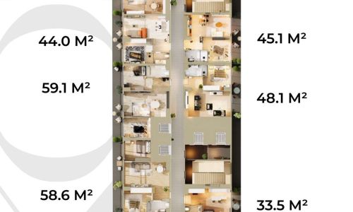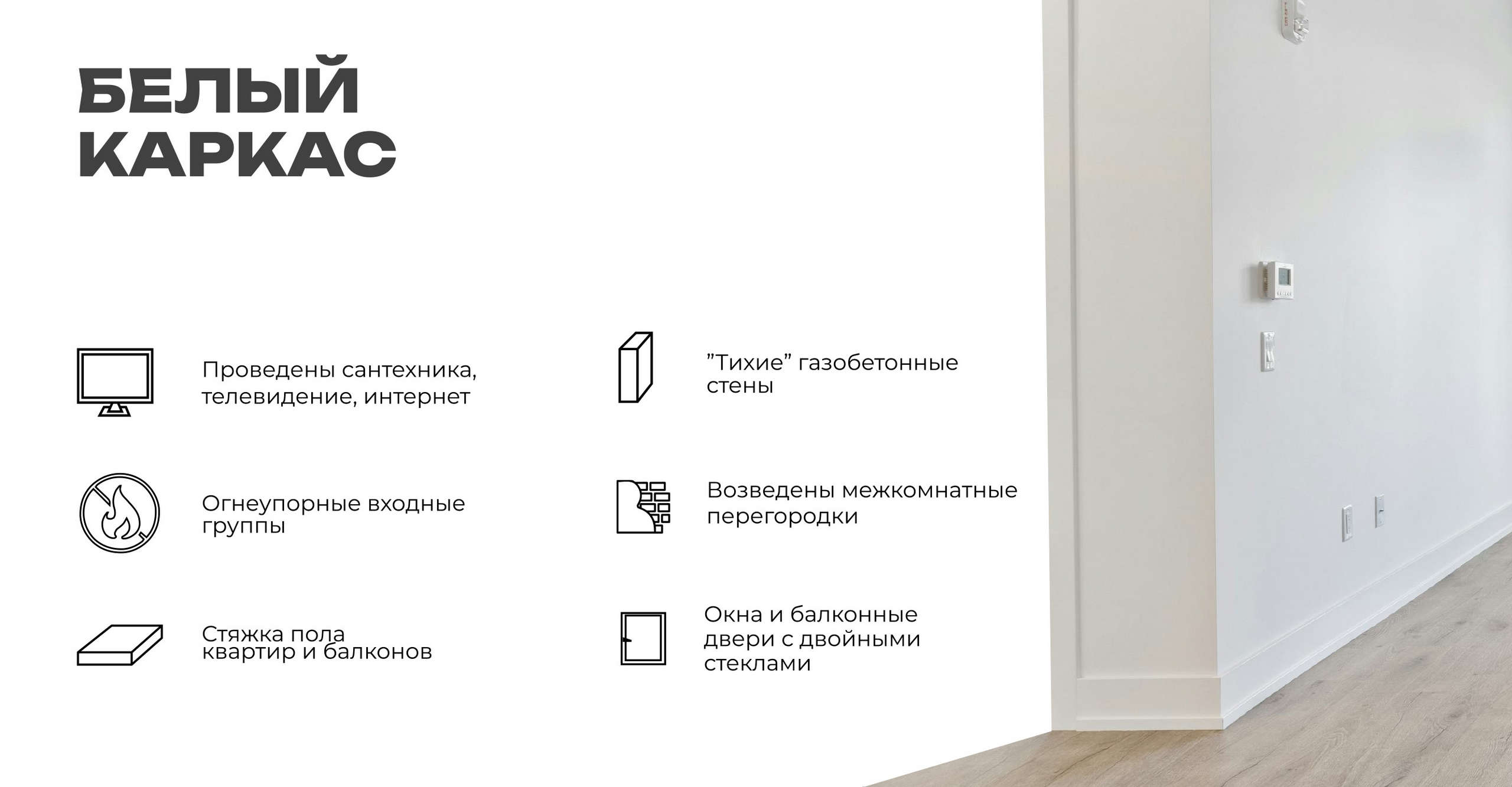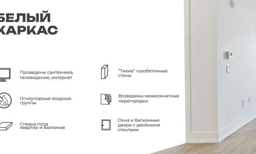 - Форматы от компактных студий до 1-спальных, высота потолков около 3 м, можно сделать дизайн «под себя» (white frame / shell & core)