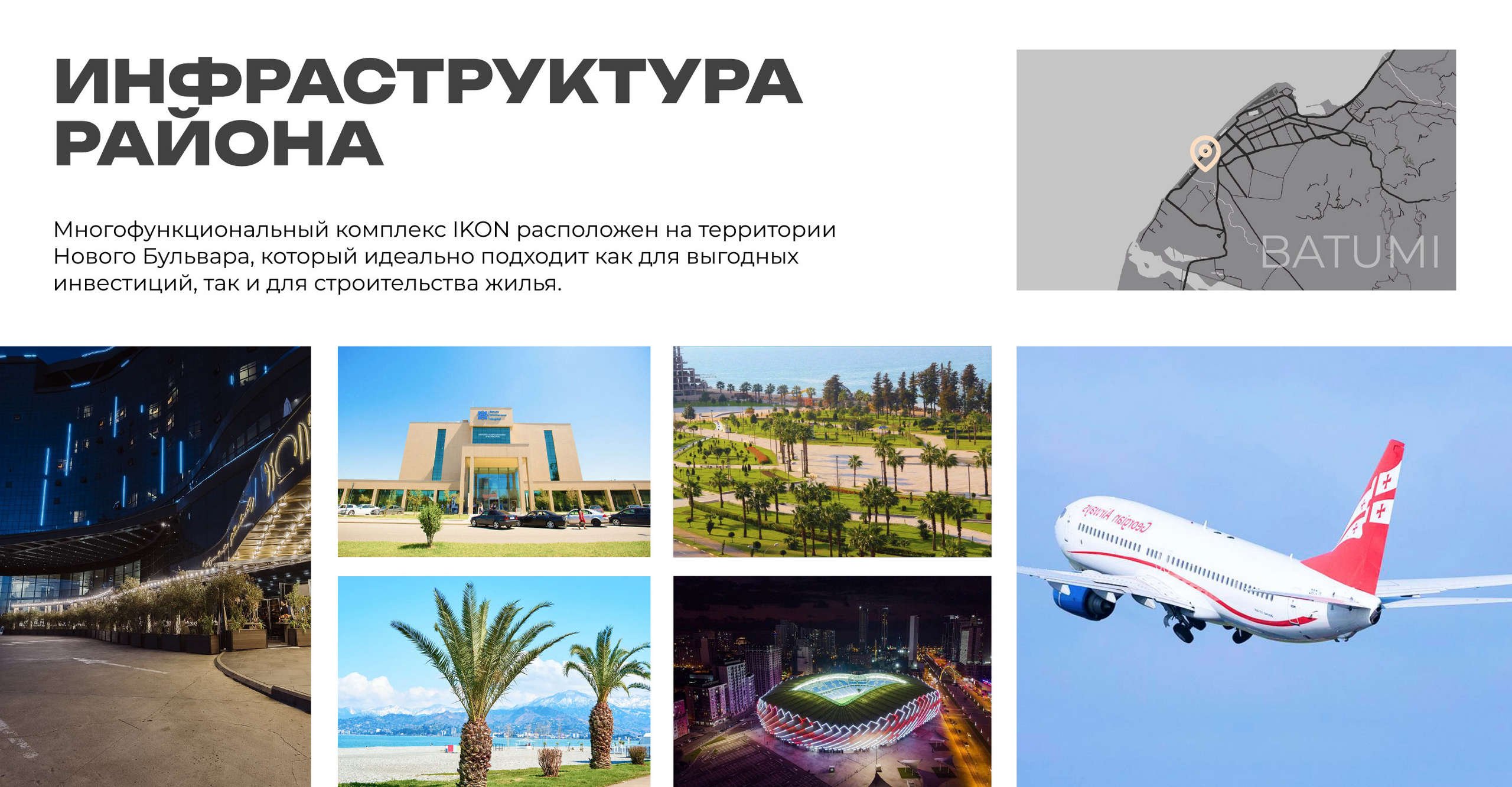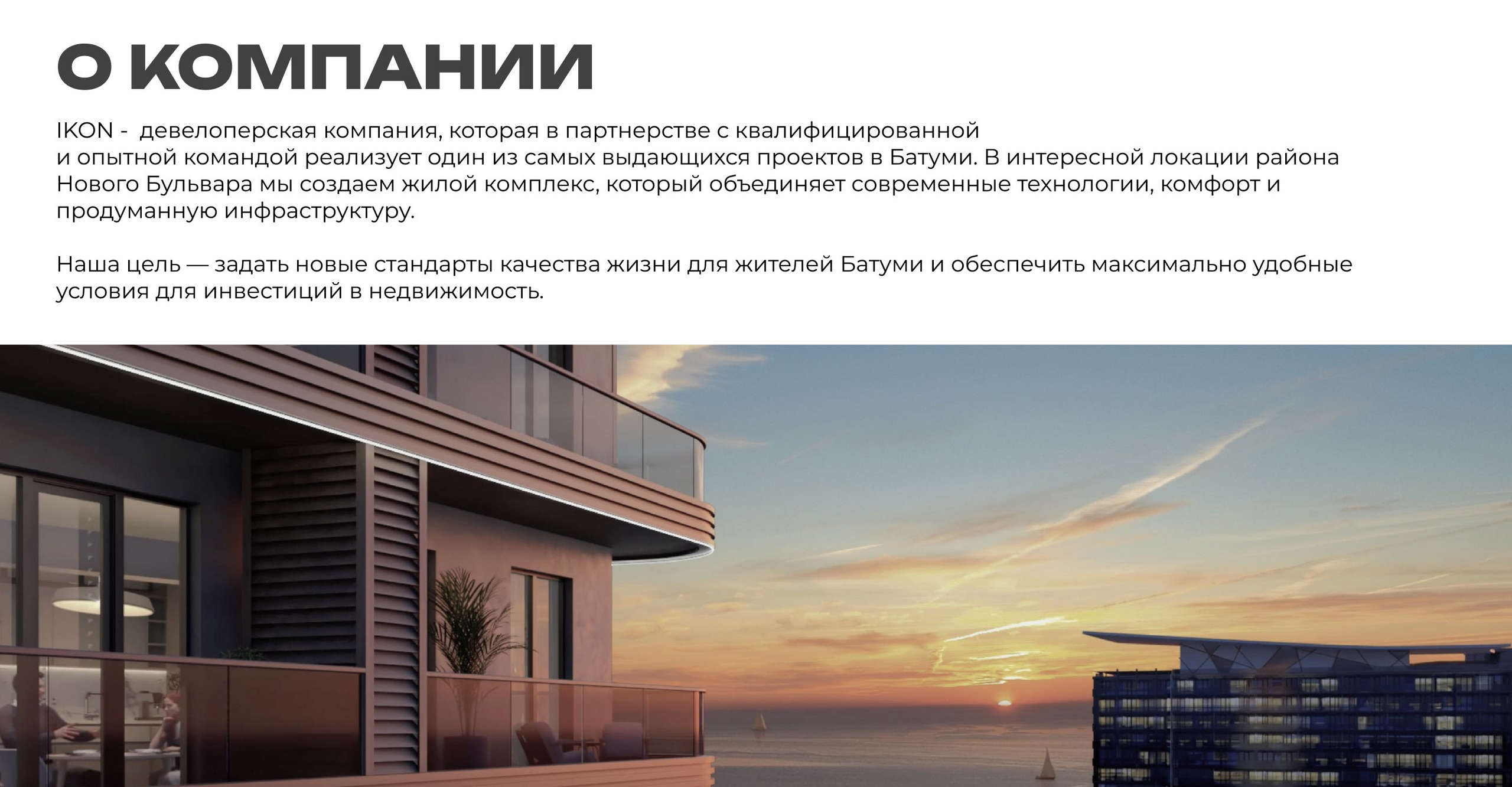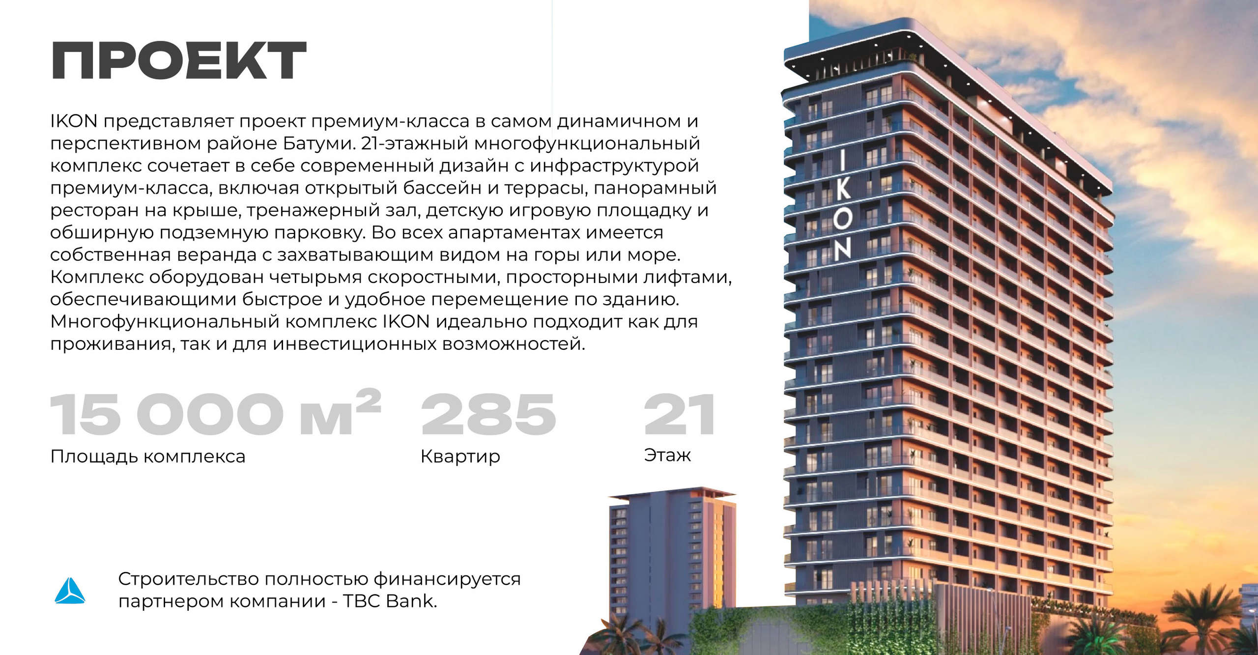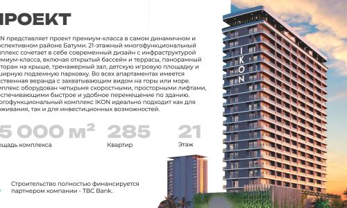 IKON представляет проект премиум-класса в самом динамичном и перспективном районе Батуми. 21-этажный многофункциональный комплекс сочетает в себе современный дизайн с инфраструктурой премиум-класса.
