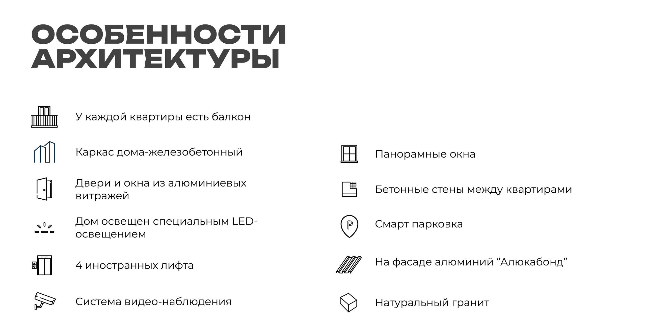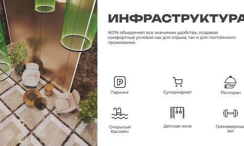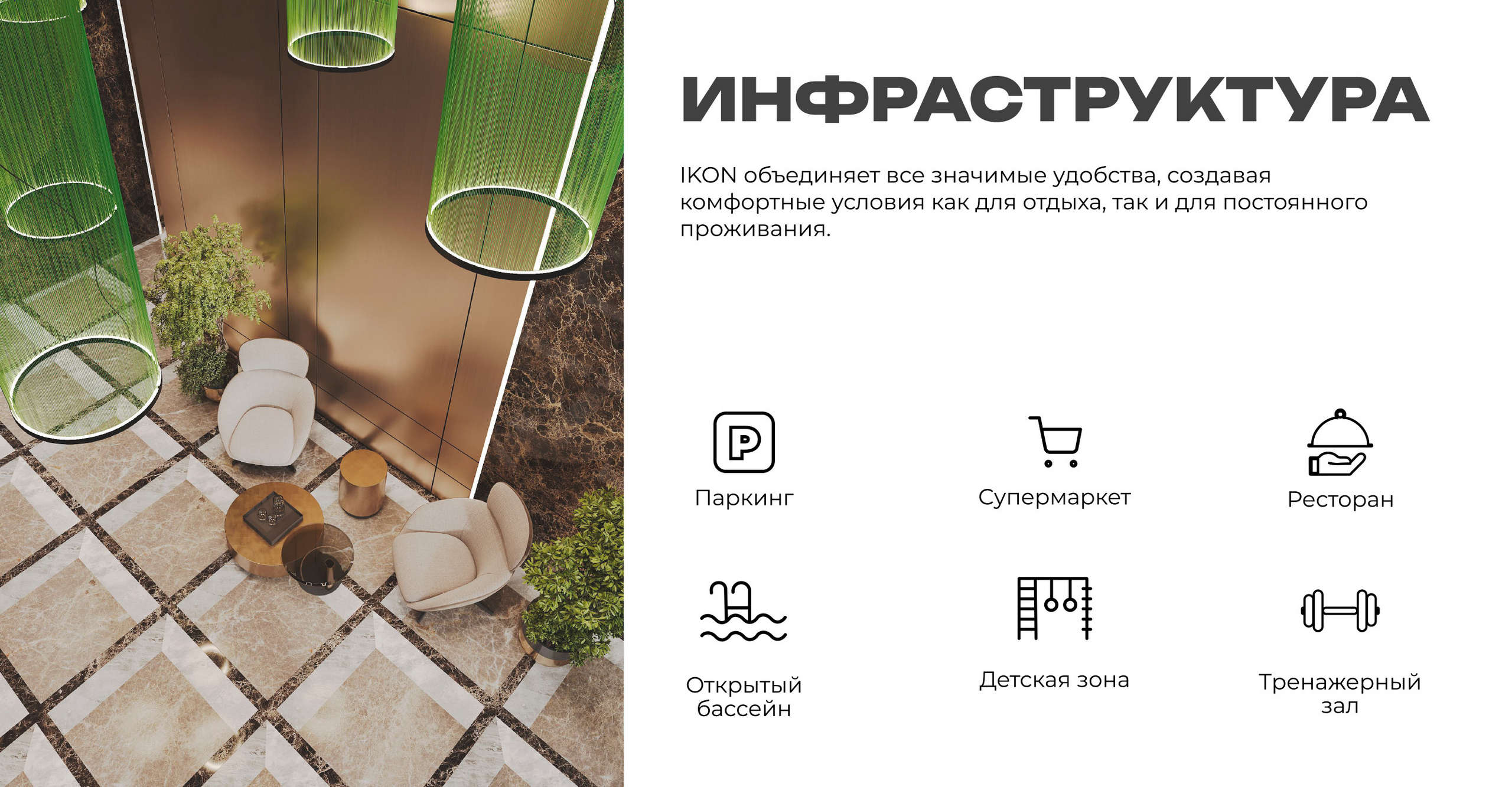 - Полный набор сервисов: открытый бассейн, фитнес, детская площадка, супермаркет, ресторан, панорамный rooftop-ресторан, трёхуровневый подземный паркинг