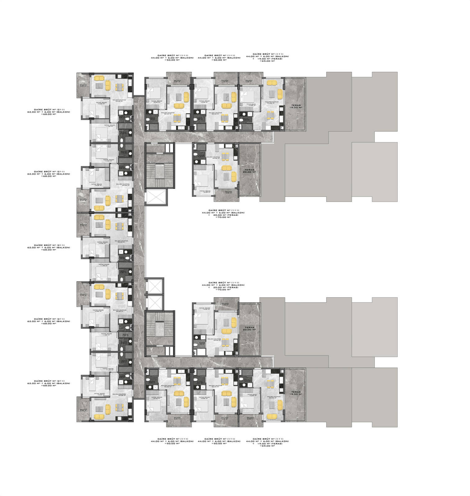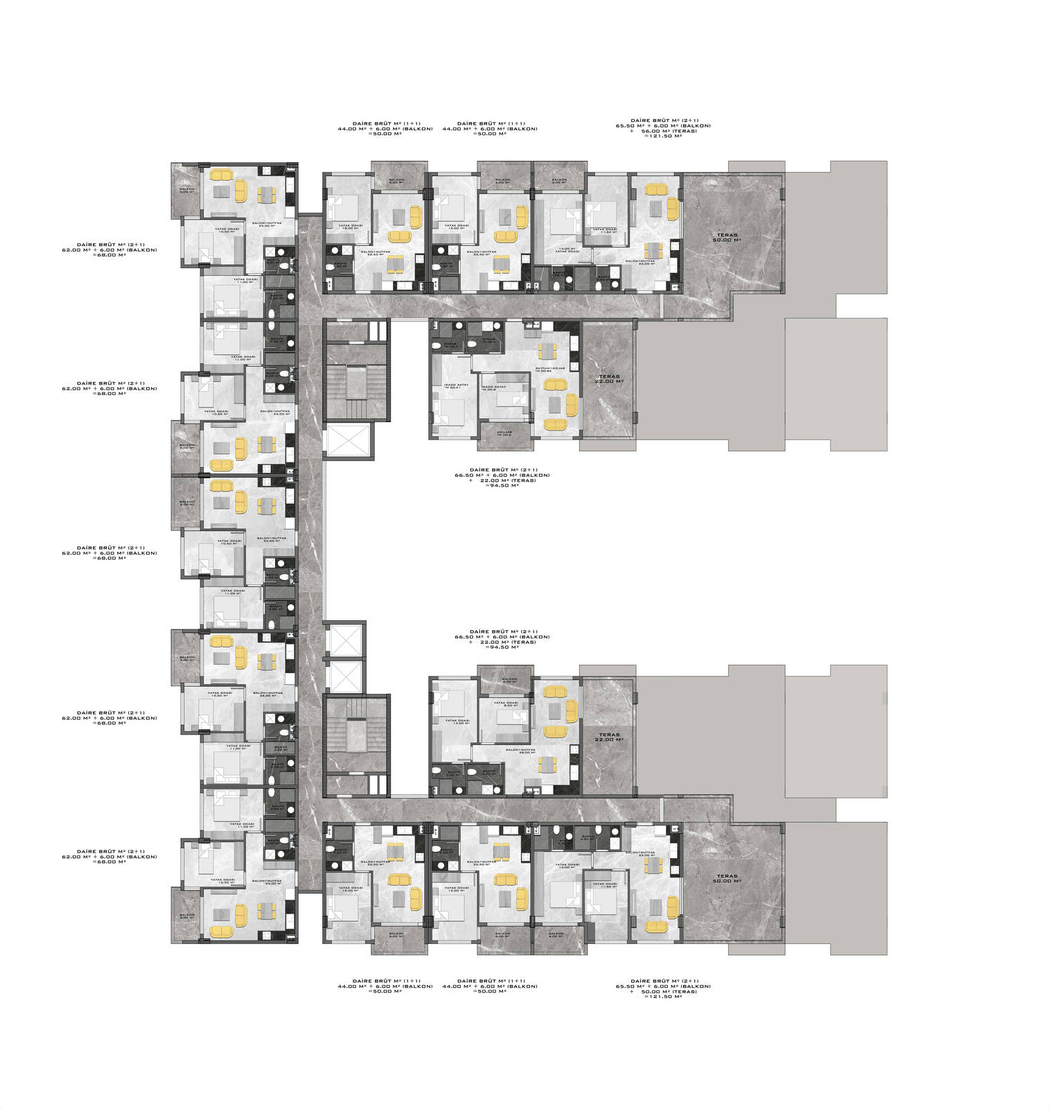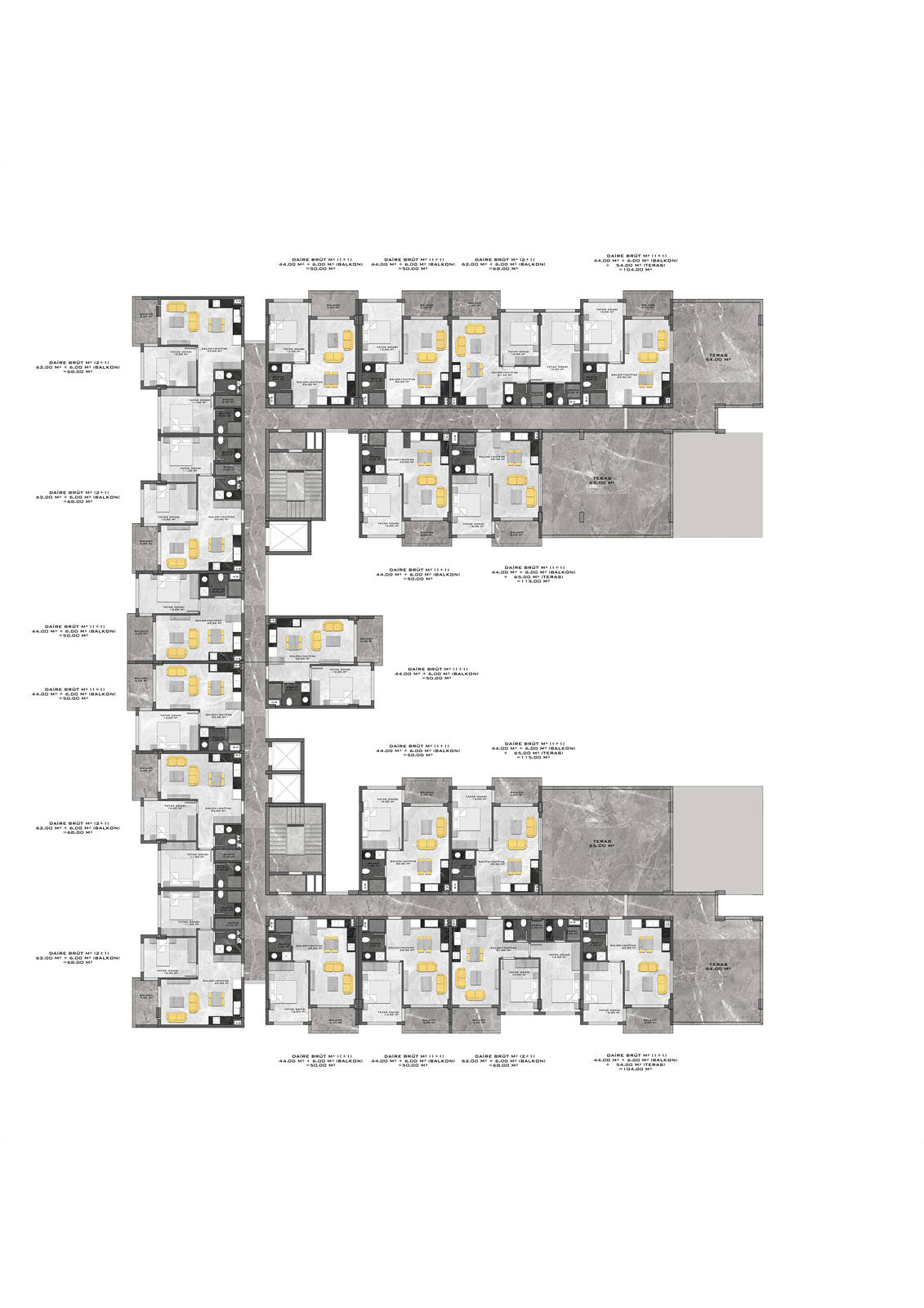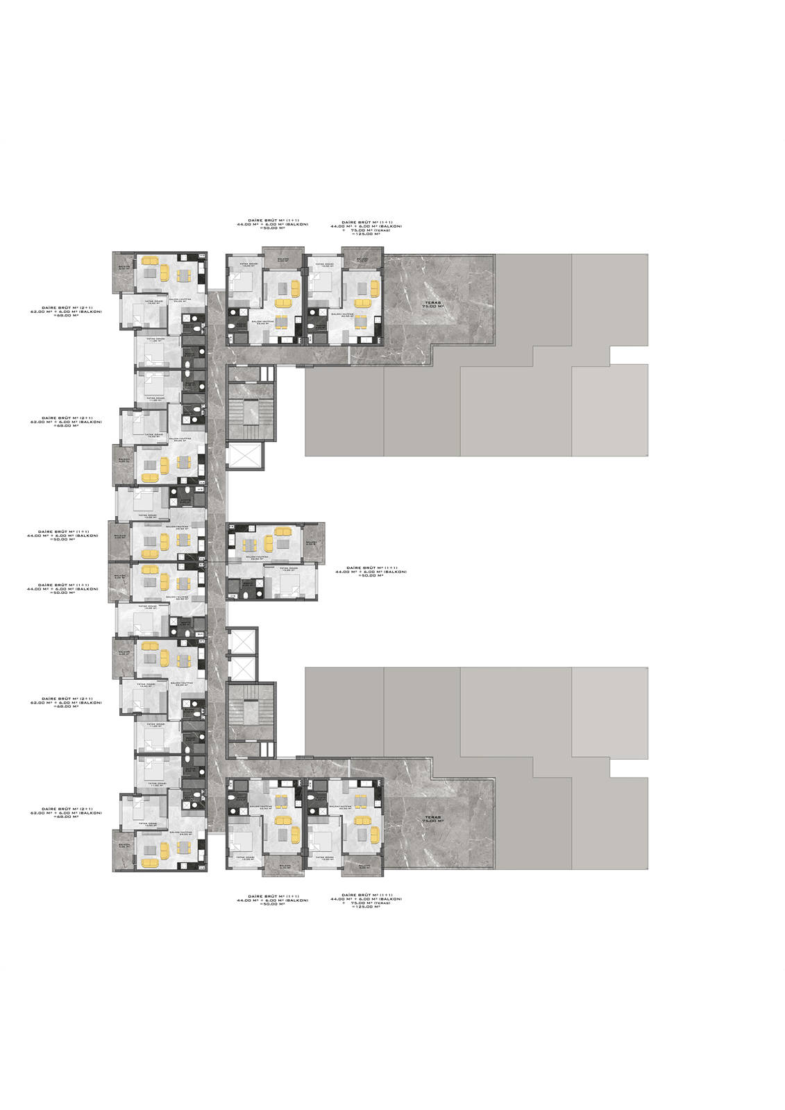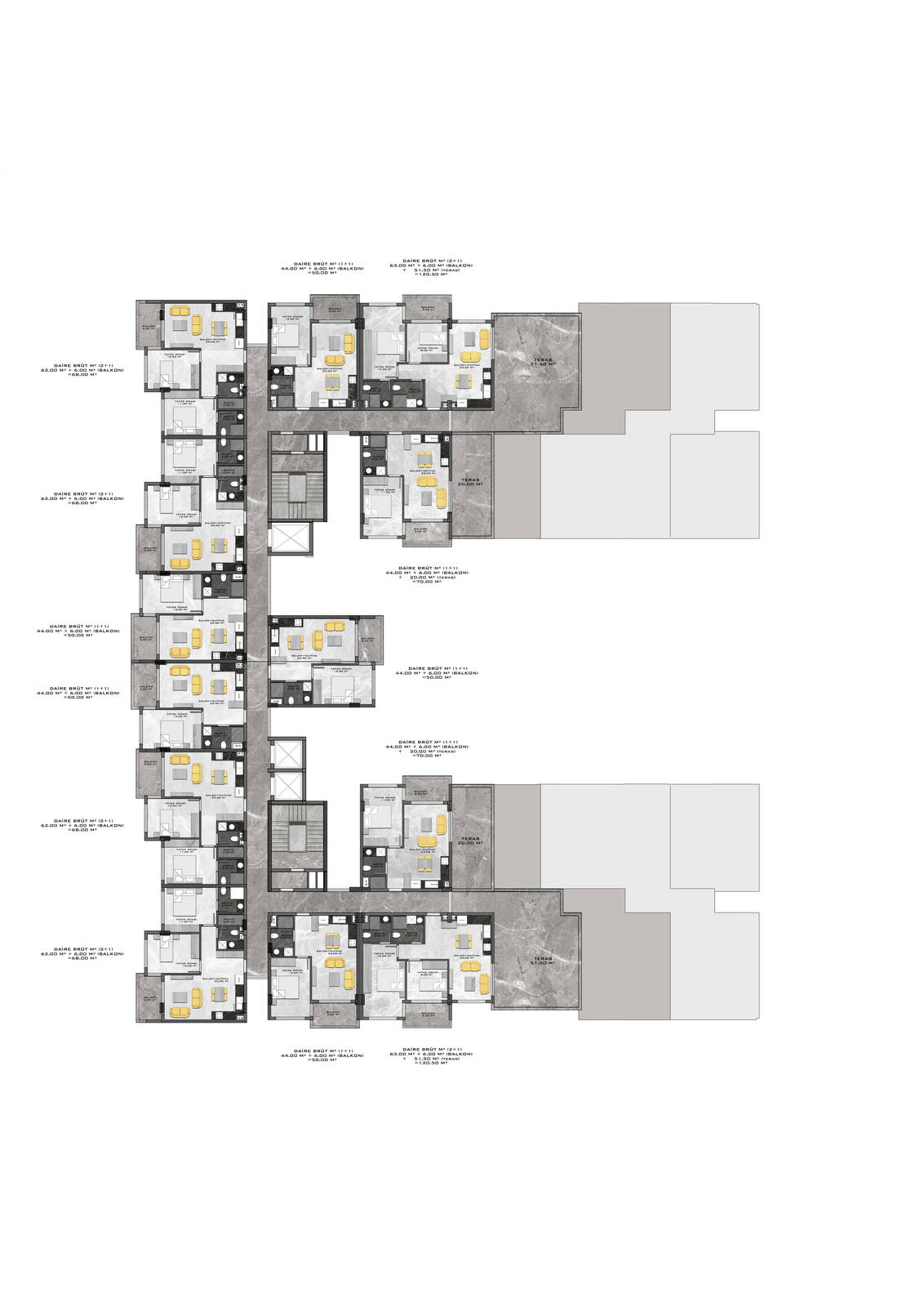 Всего 331 квартира в 3 блоках комплекса: 1+1, 2+1. Есть апартаменты с собственным садиком и с собственной террасой с бассейном.