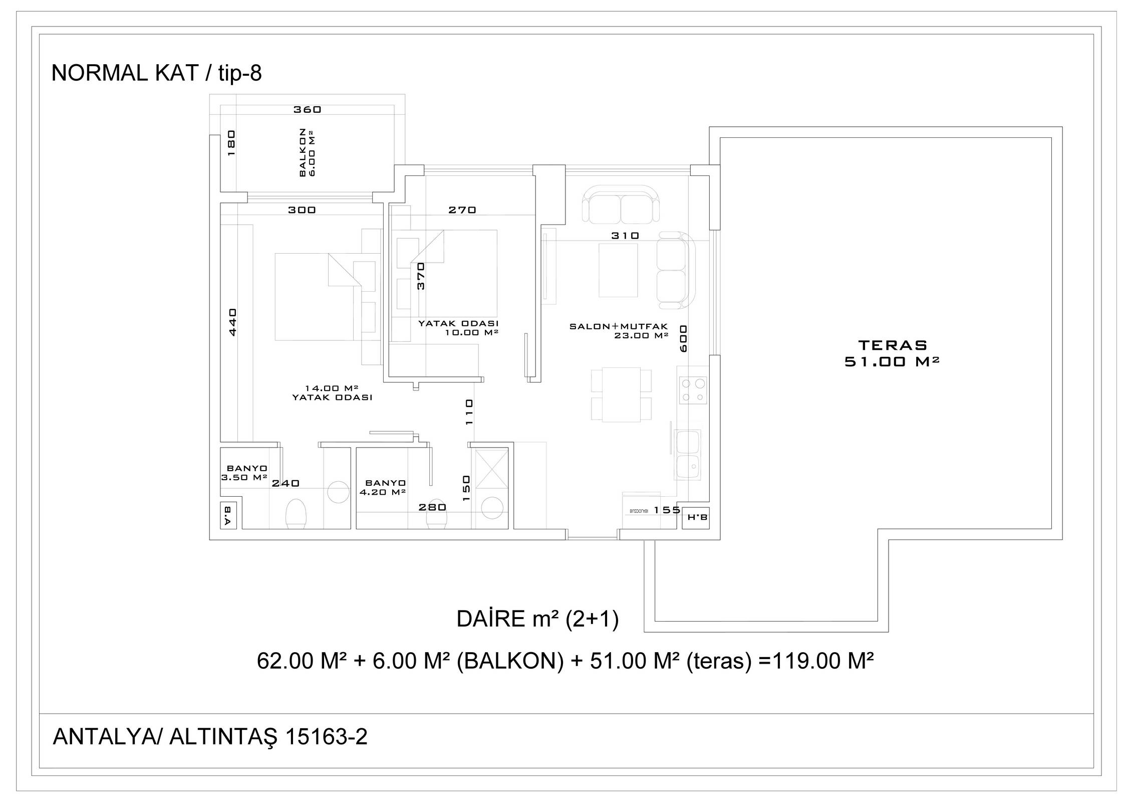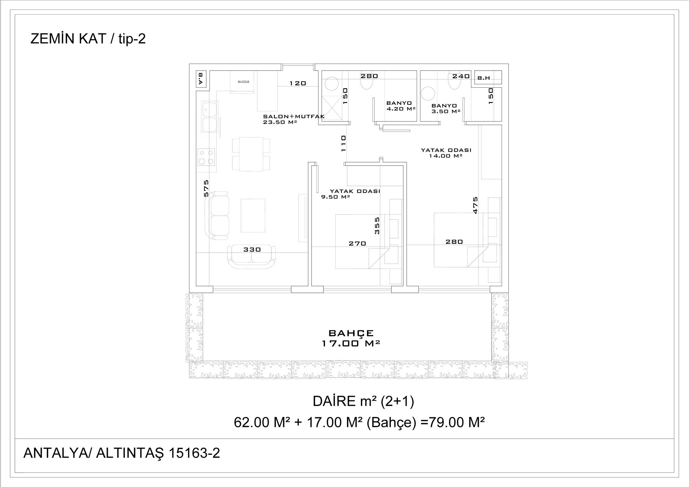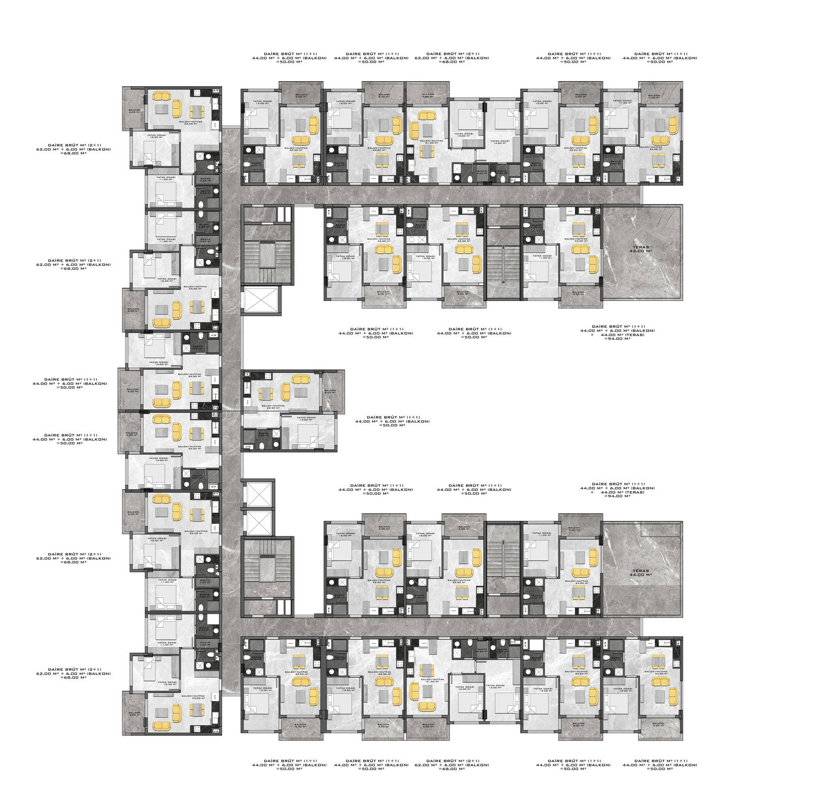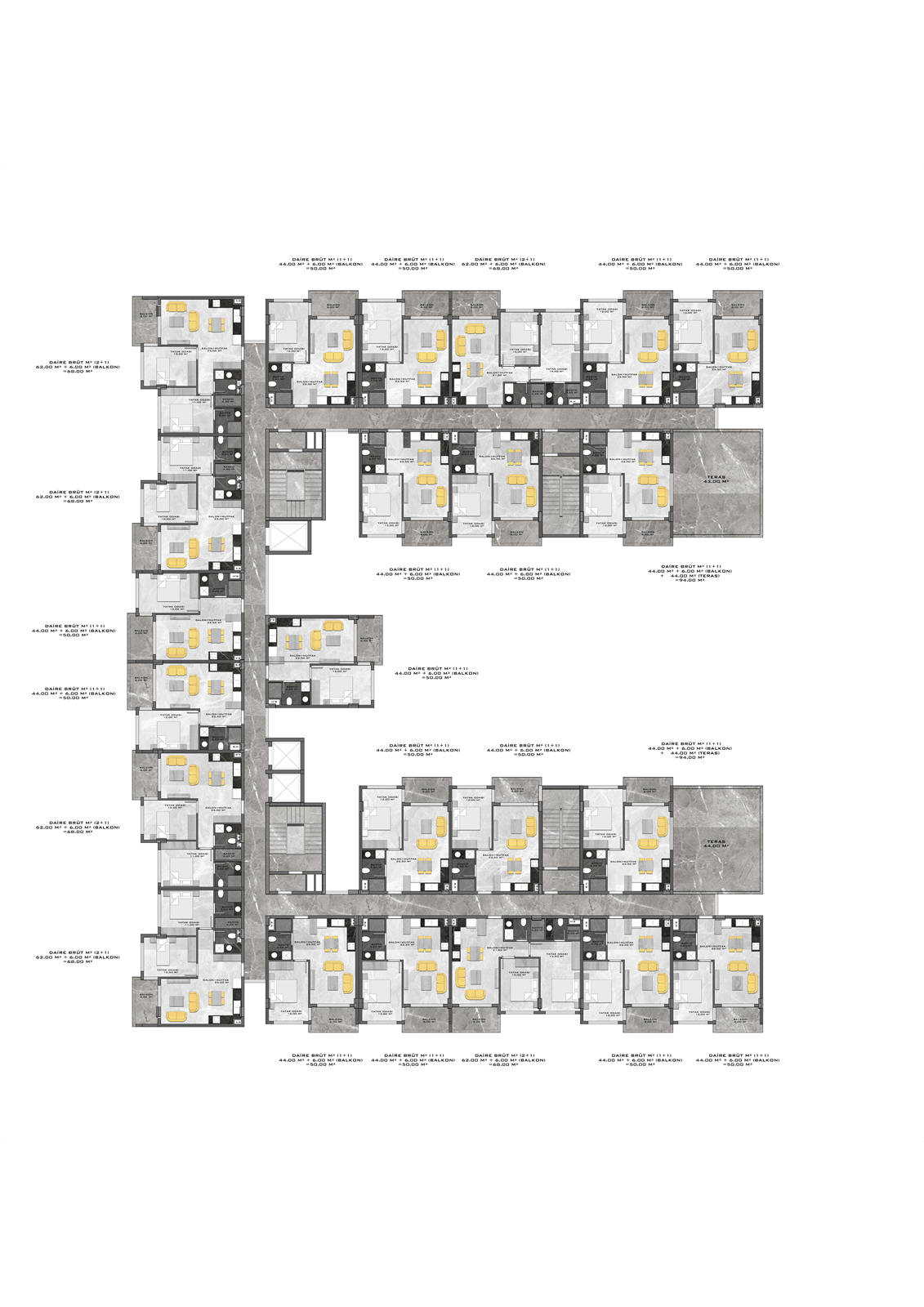 Всего 331 квартира в 3 блоках комплекса: 1+1, 2+1. Есть апартаменты с собственным садиком и с собственной террасой с бассейном.