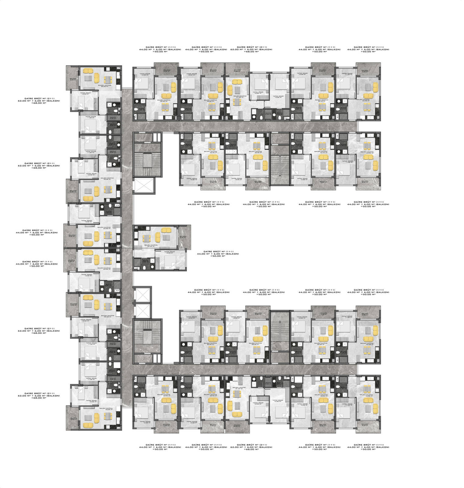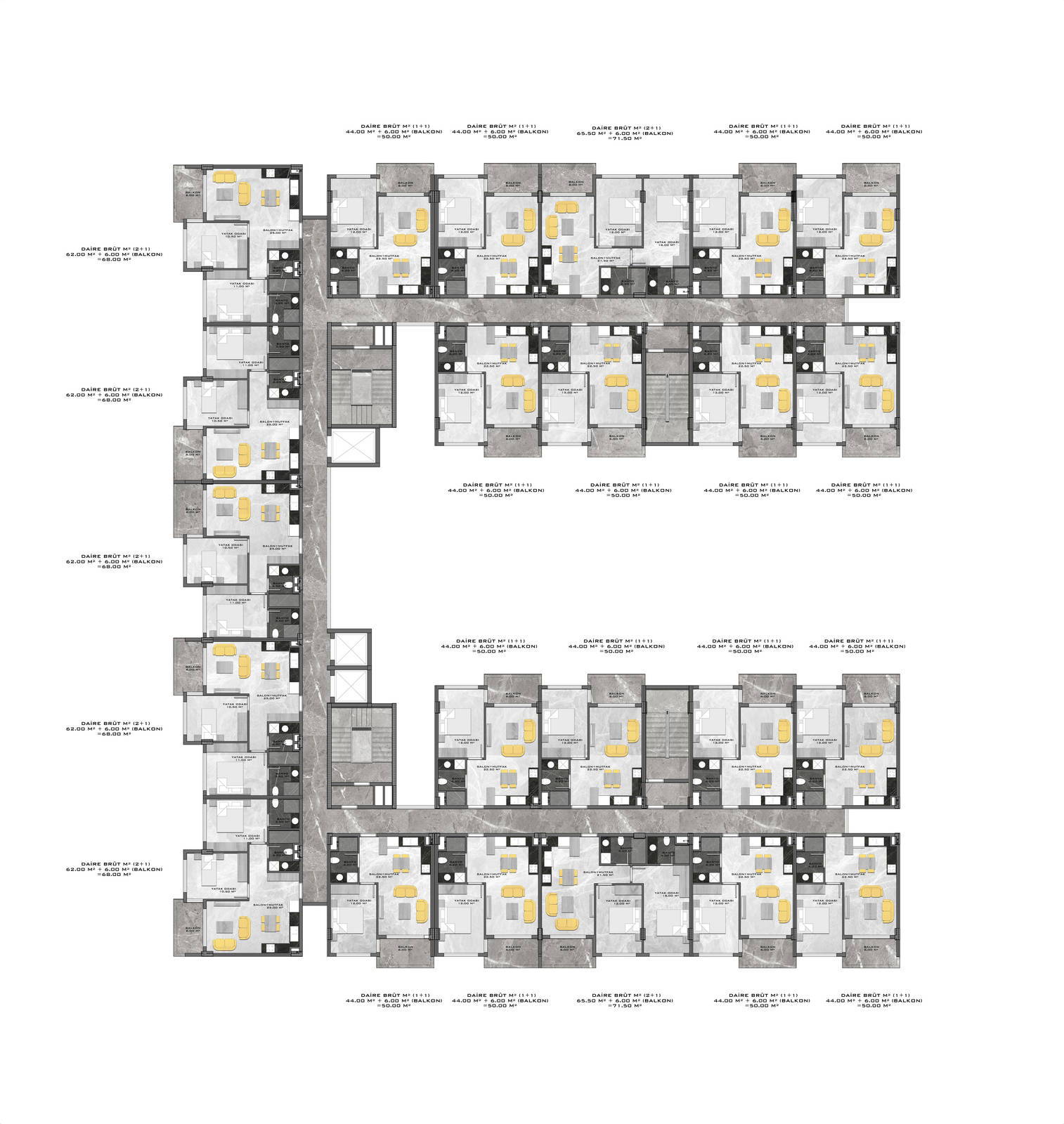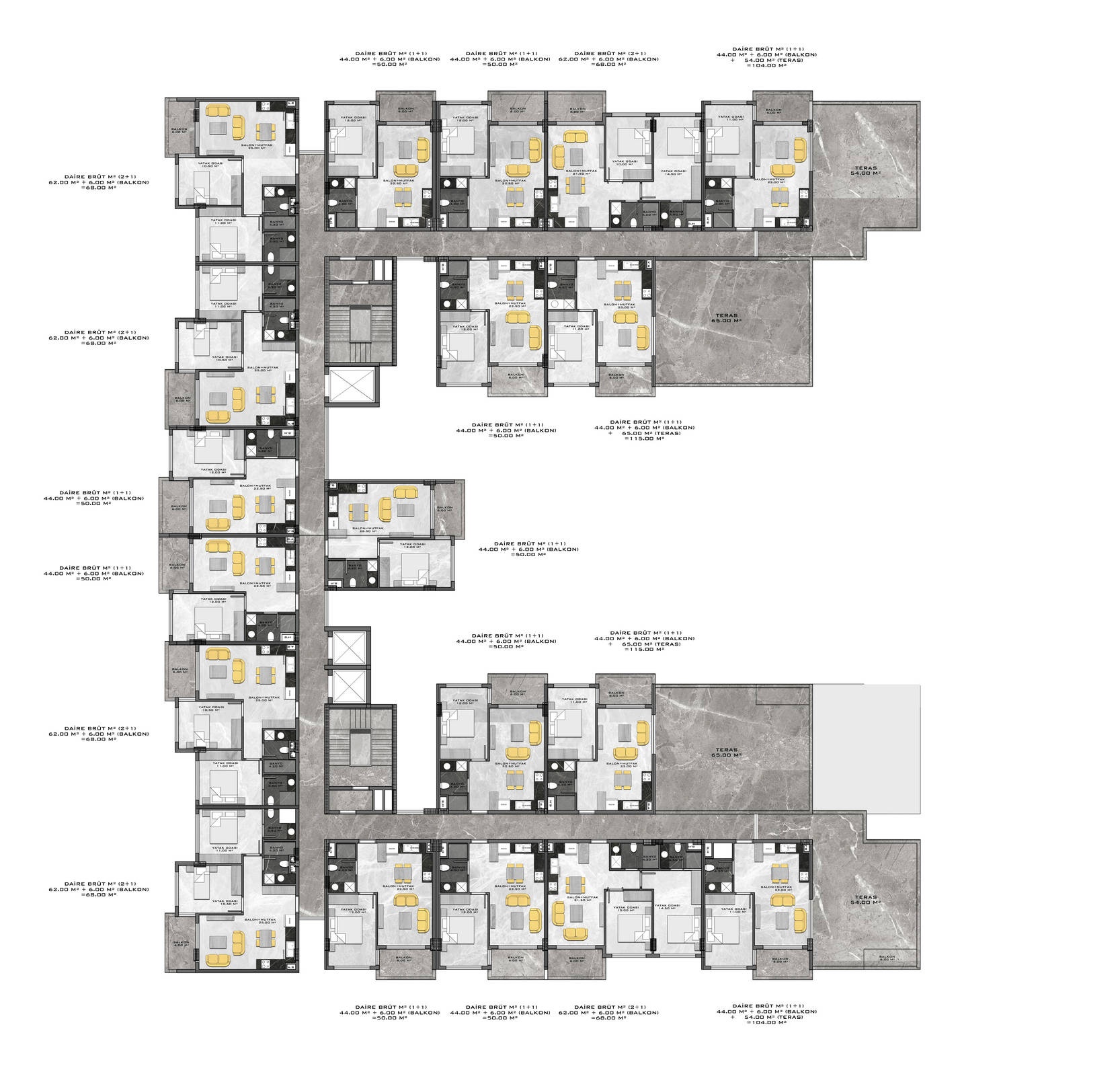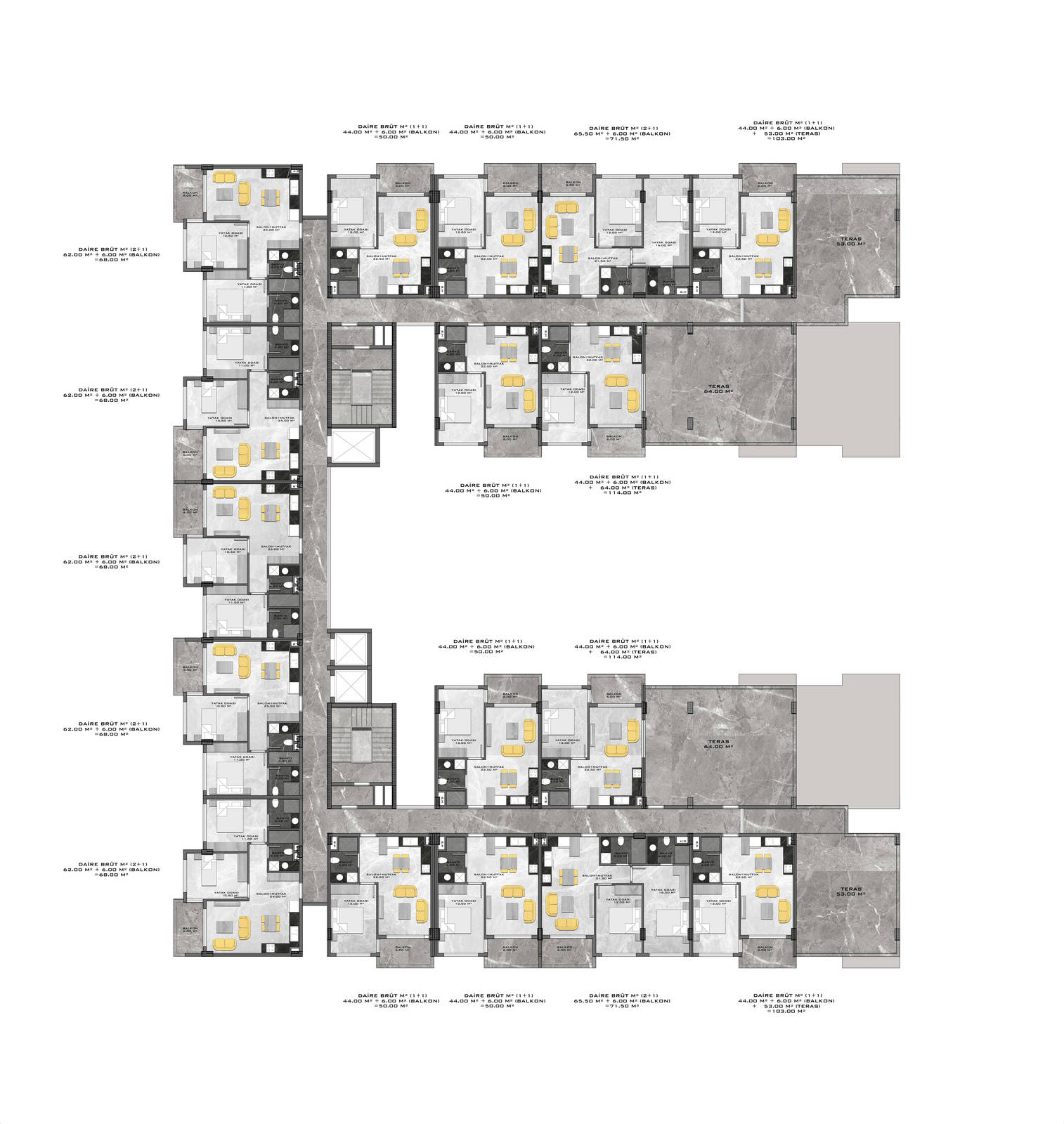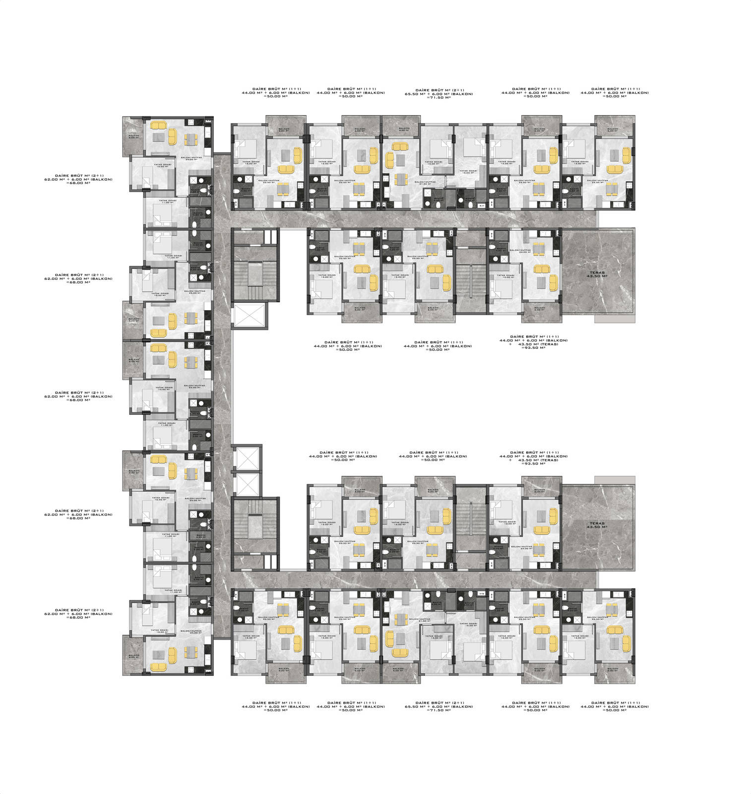 Всего 331 квартира в 3 блоках комплекса: 1+1, 2+1. Есть апартаменты с собственным садиком и с собственной террасой с бассейном.