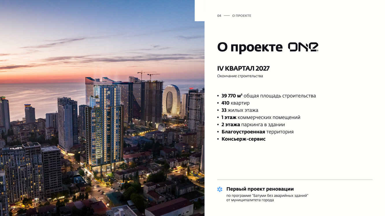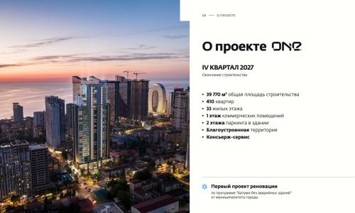 One — современный жилой комплекс в самом сердце Батуми, который объединяет стильную архитектуру, комфорт городской жизни и возможности для выгодной инвестиции.