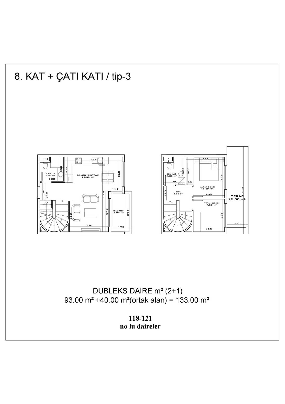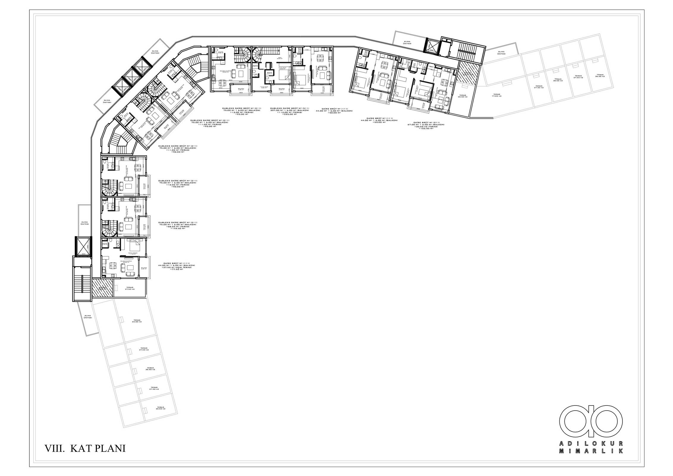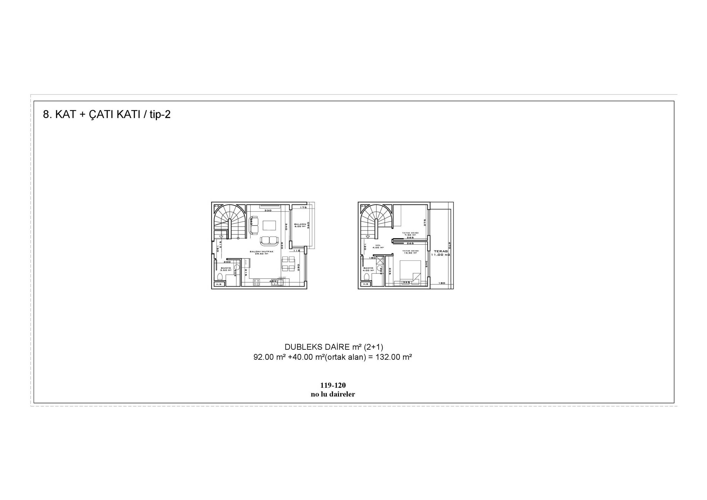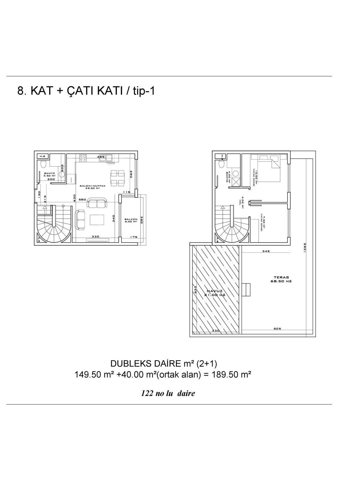 ● 5 Дуплексных пентхаусных 2+1 (92.5 – 93.5 – 155.5 m²)