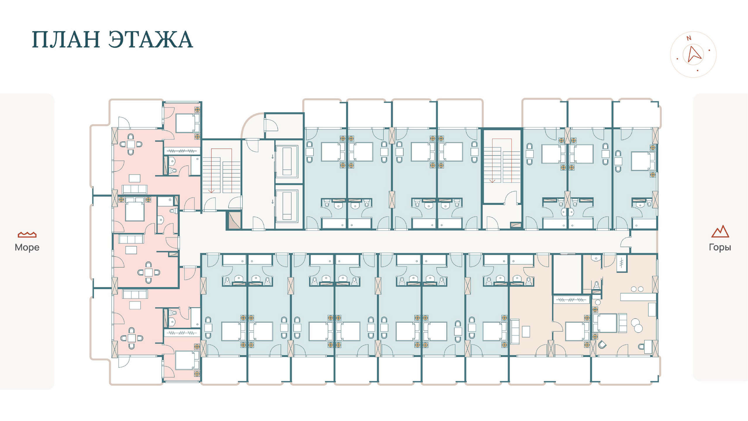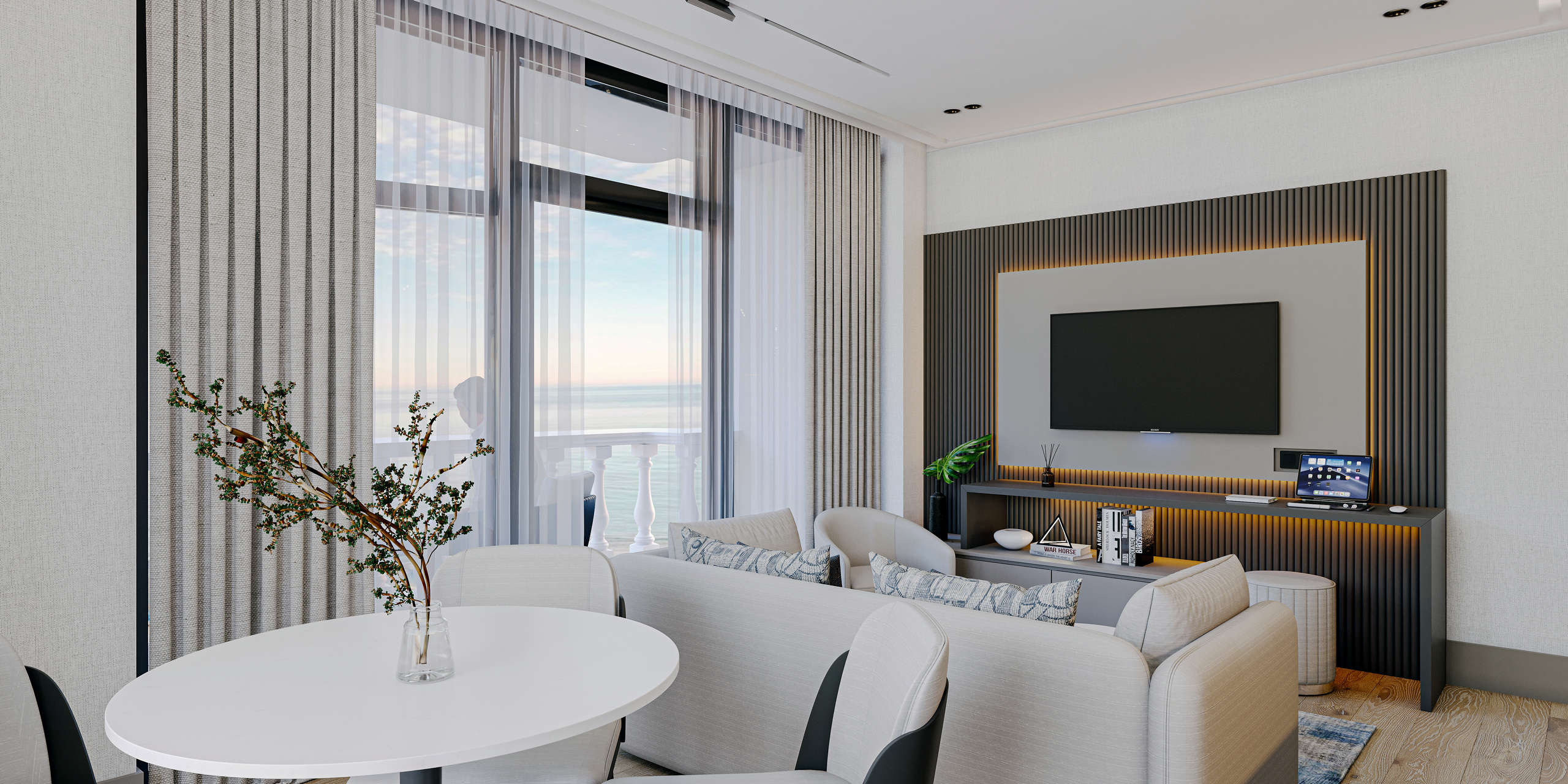 Проект совмещает функции санаторно-курортного отеля, modern medical clinic, аква-зоны и развитой инфраструктуры — всё в одном здании, в пешей доступности от моря.
