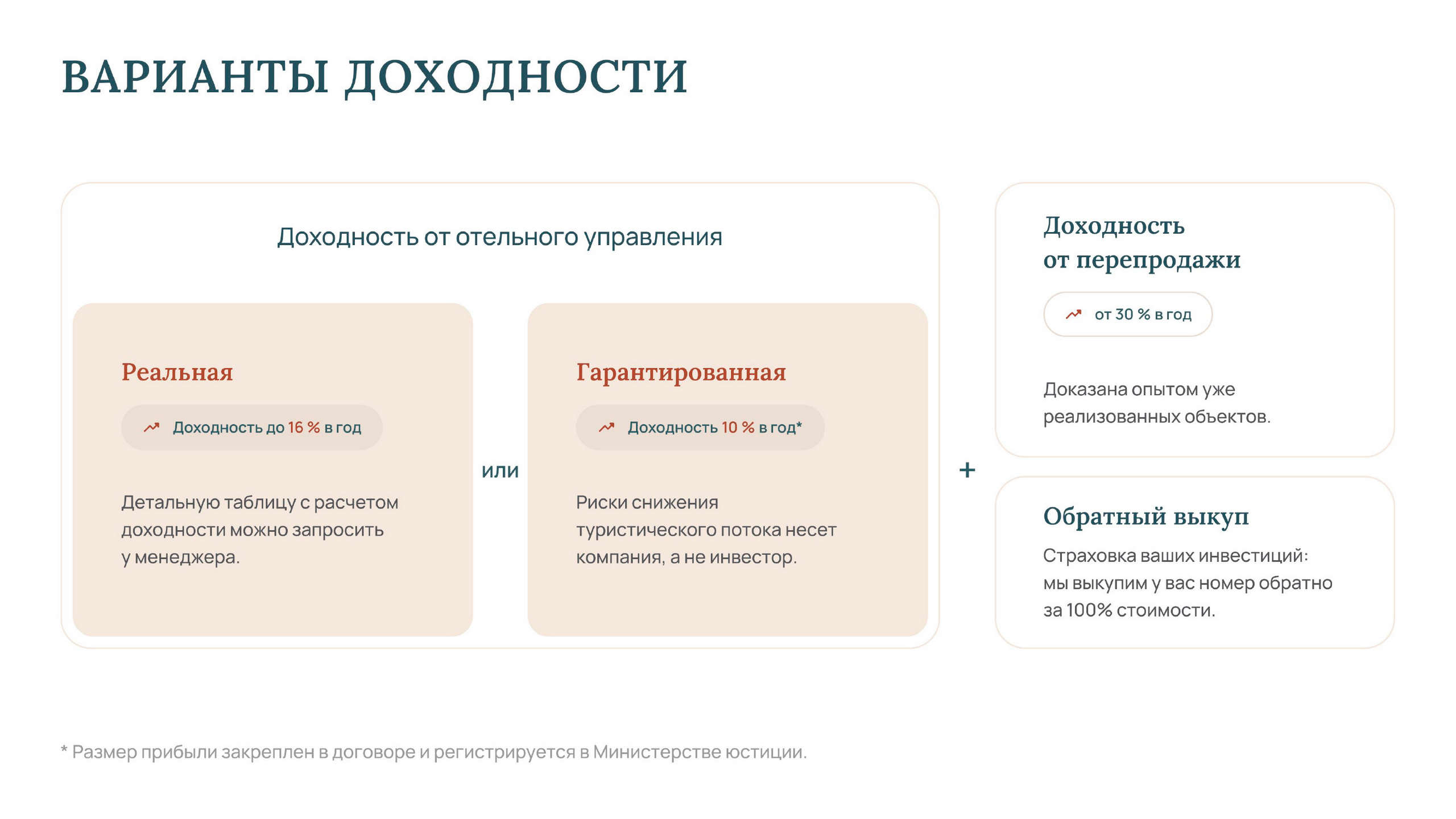 - Доход от управления номером до 16% в год + рост капитала до 30% в год по данным девелопера