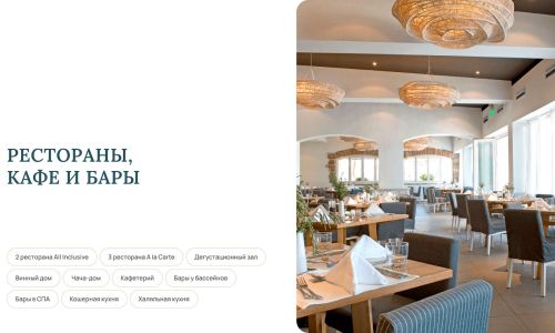- 12 ресторанов, кафе и баров (All Inclusive и à la carte, винный дом, дегустационные комнаты, бары у бассейна);