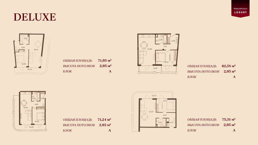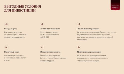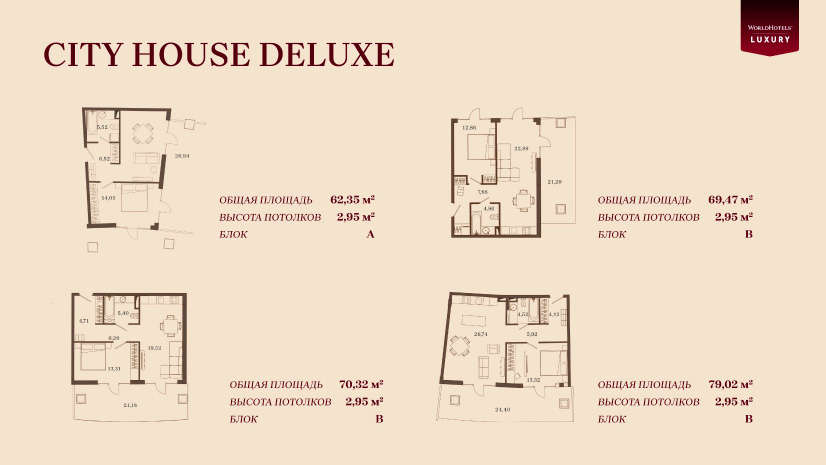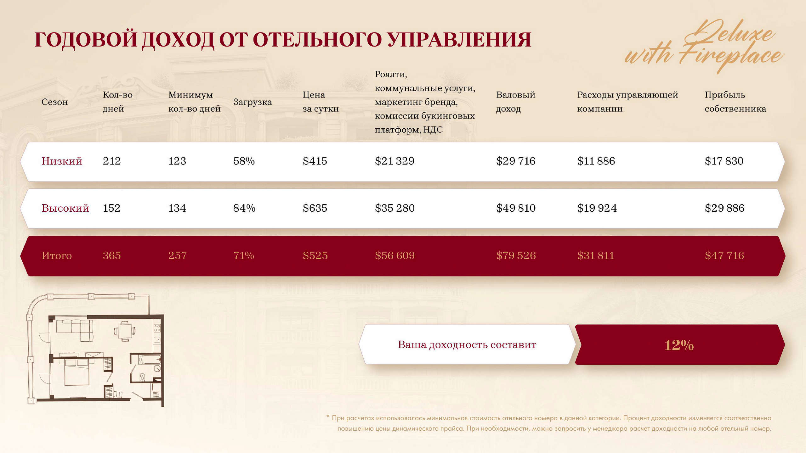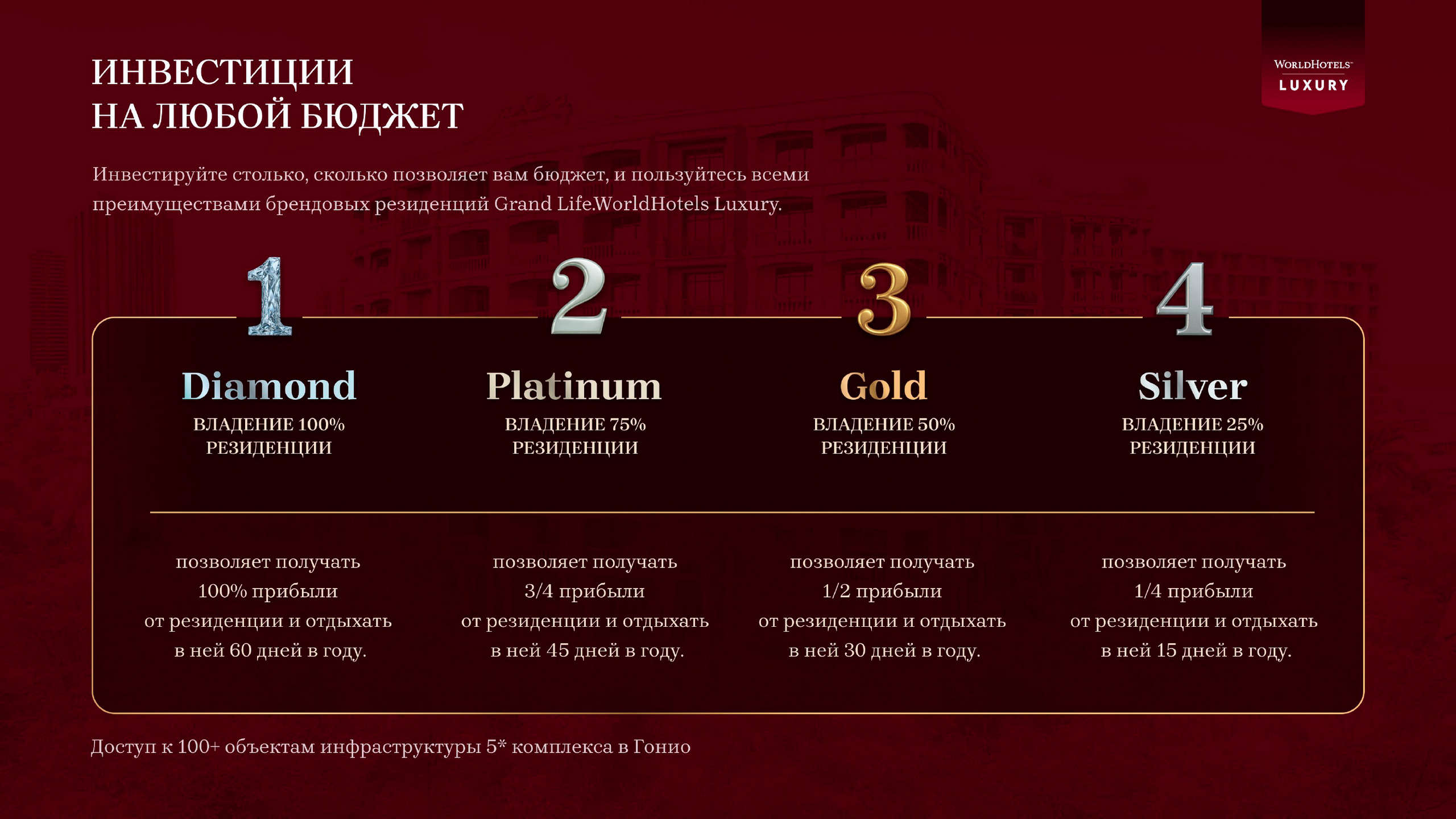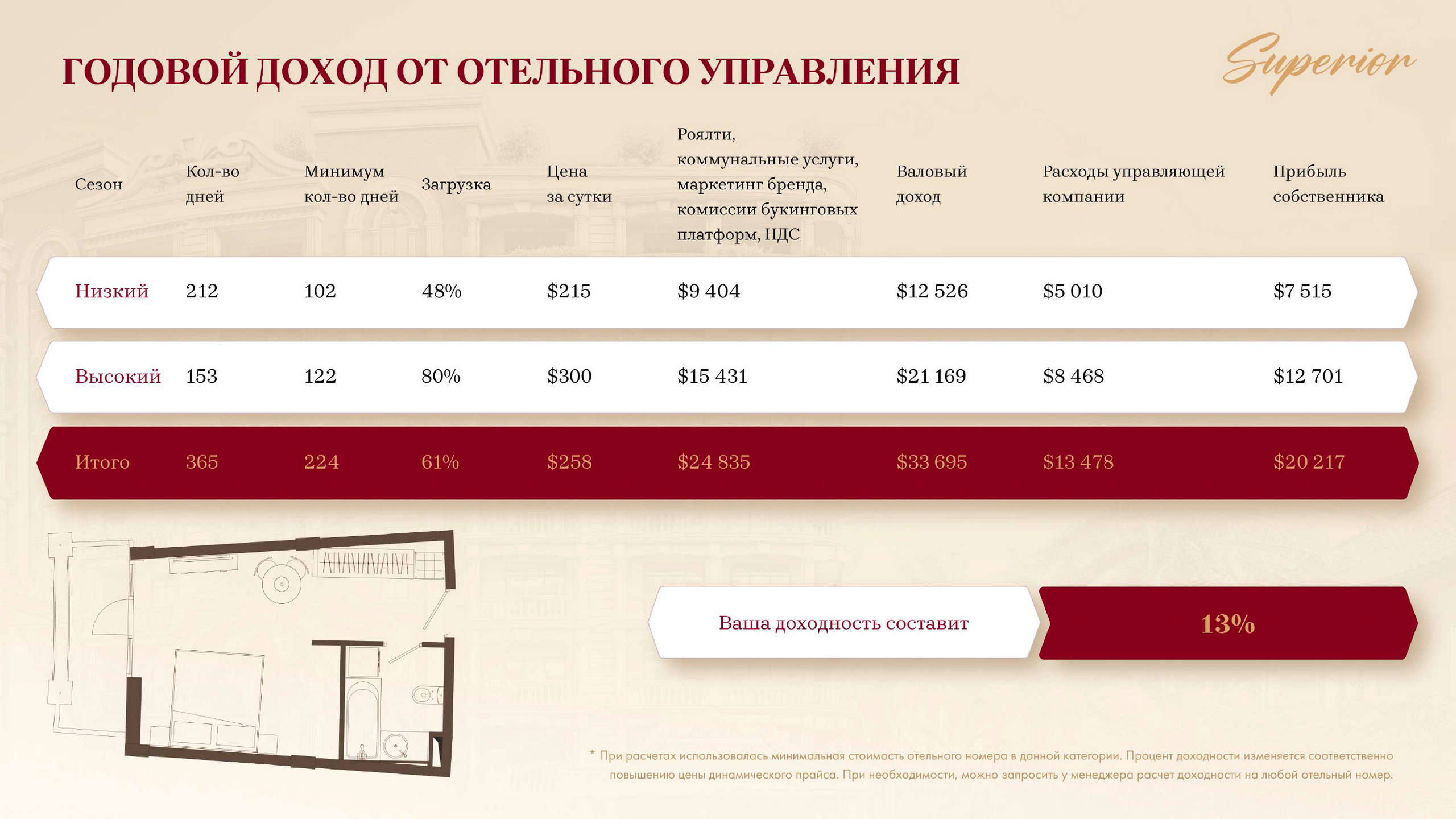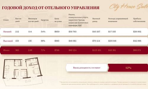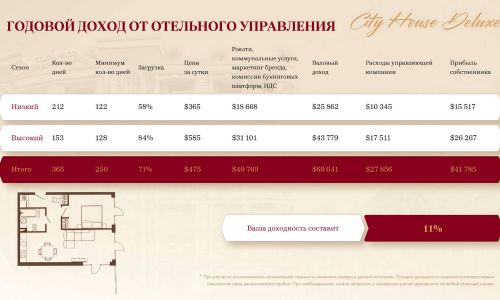 - подобрать оптимальный тип резиденции (Superior, Deluxe, Suite, City House) под цель: доход / отдых / престиж;