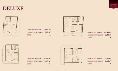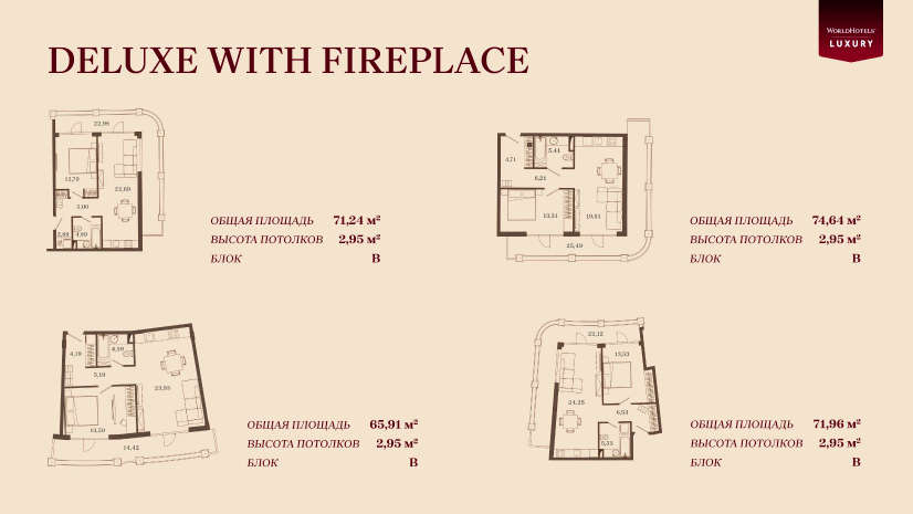 - футурный дизайн, возможны варианты с камином (Deluxe with Fireplace от 65 м²).