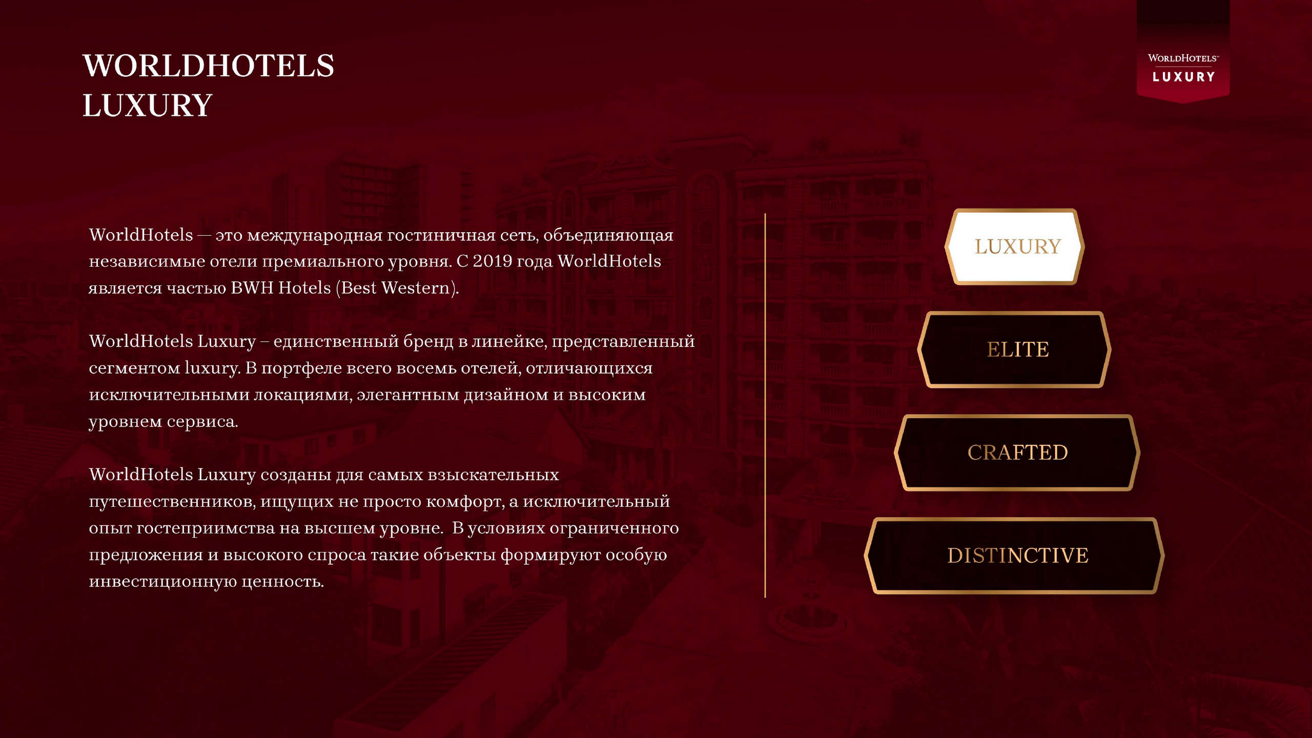- 5★ уровень сервиса и бренда: WorldHotels Luxury + European Village