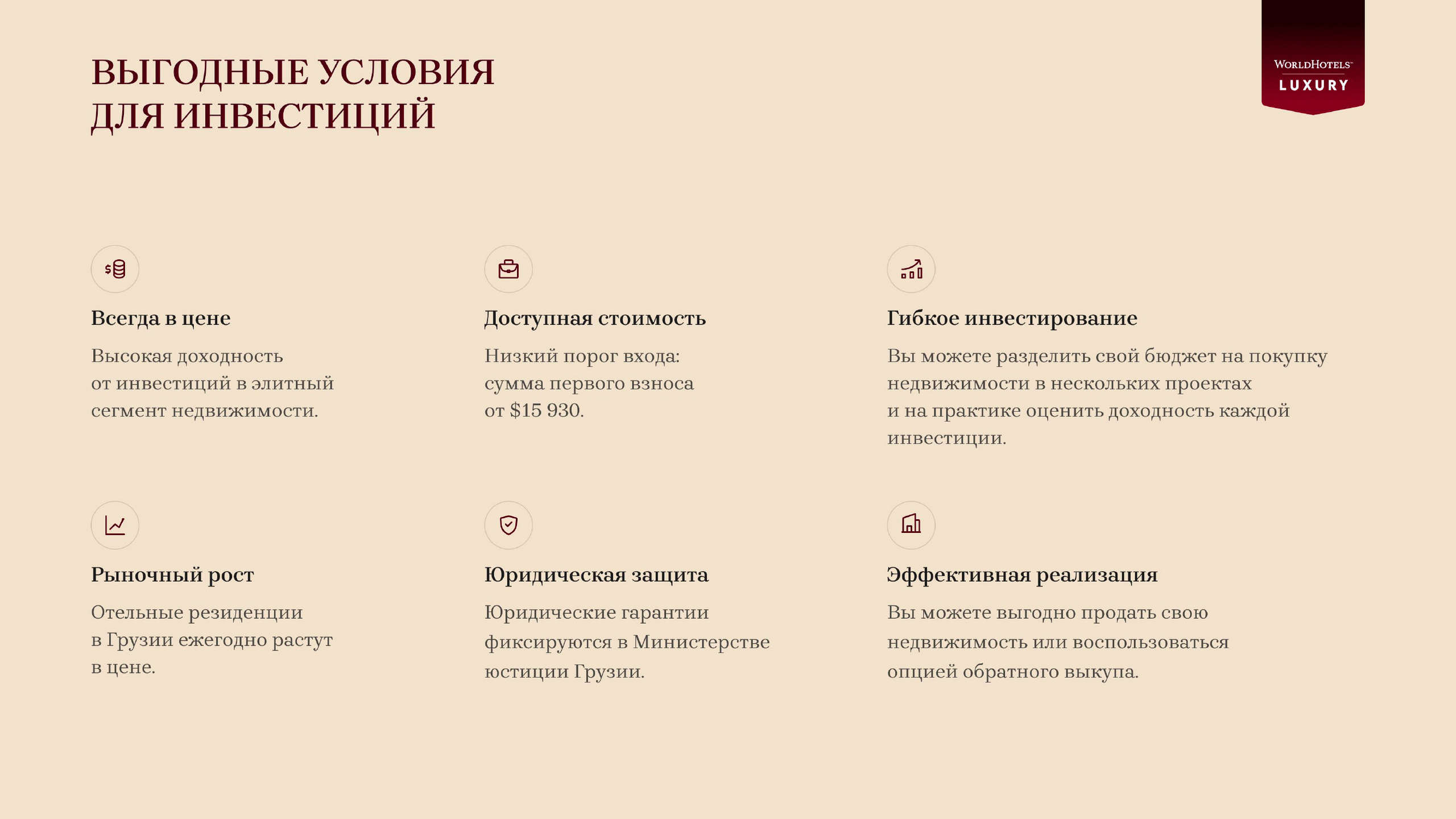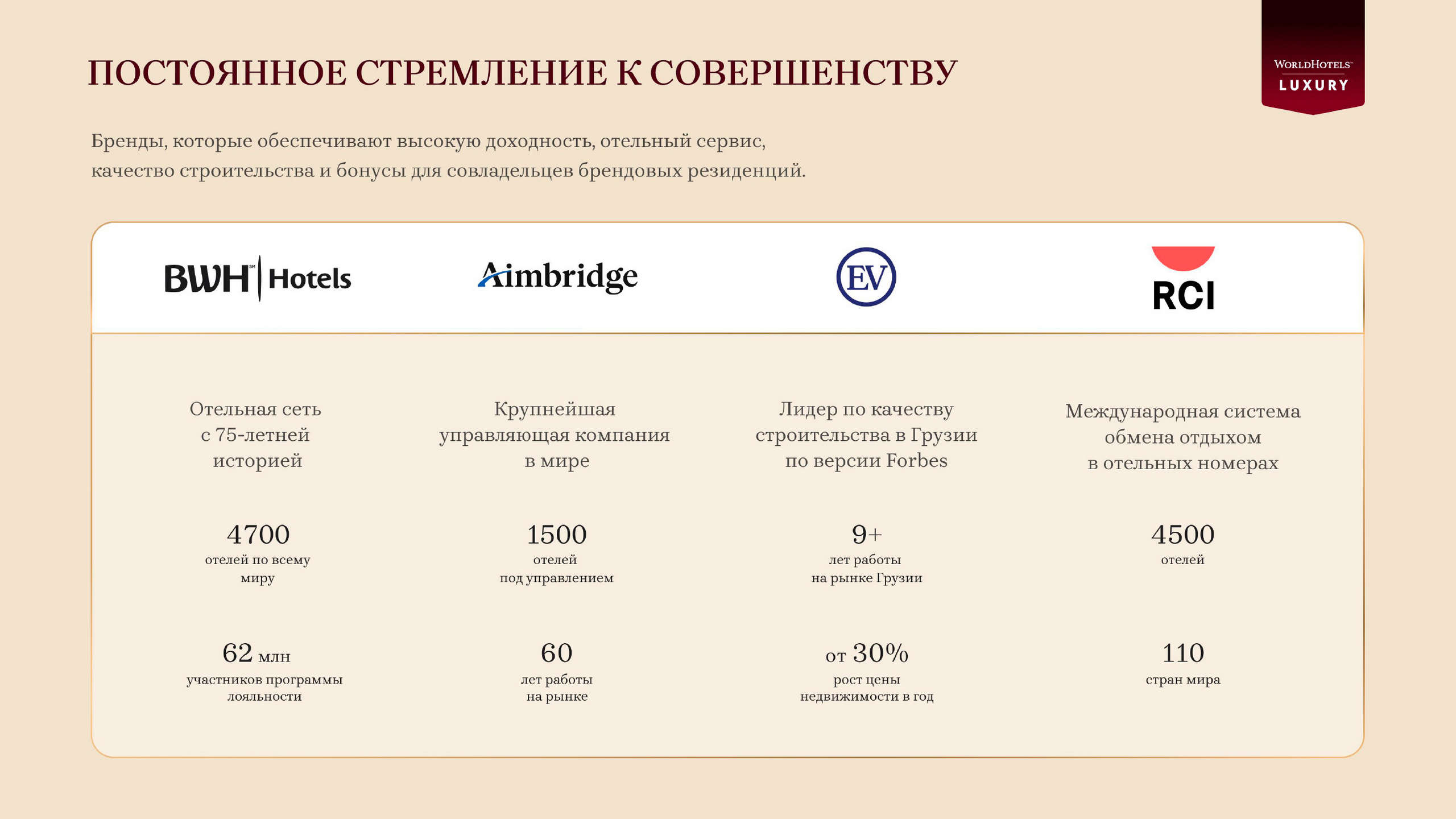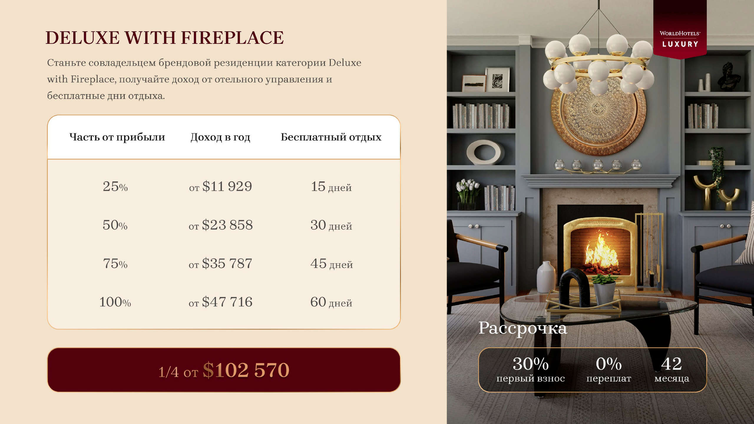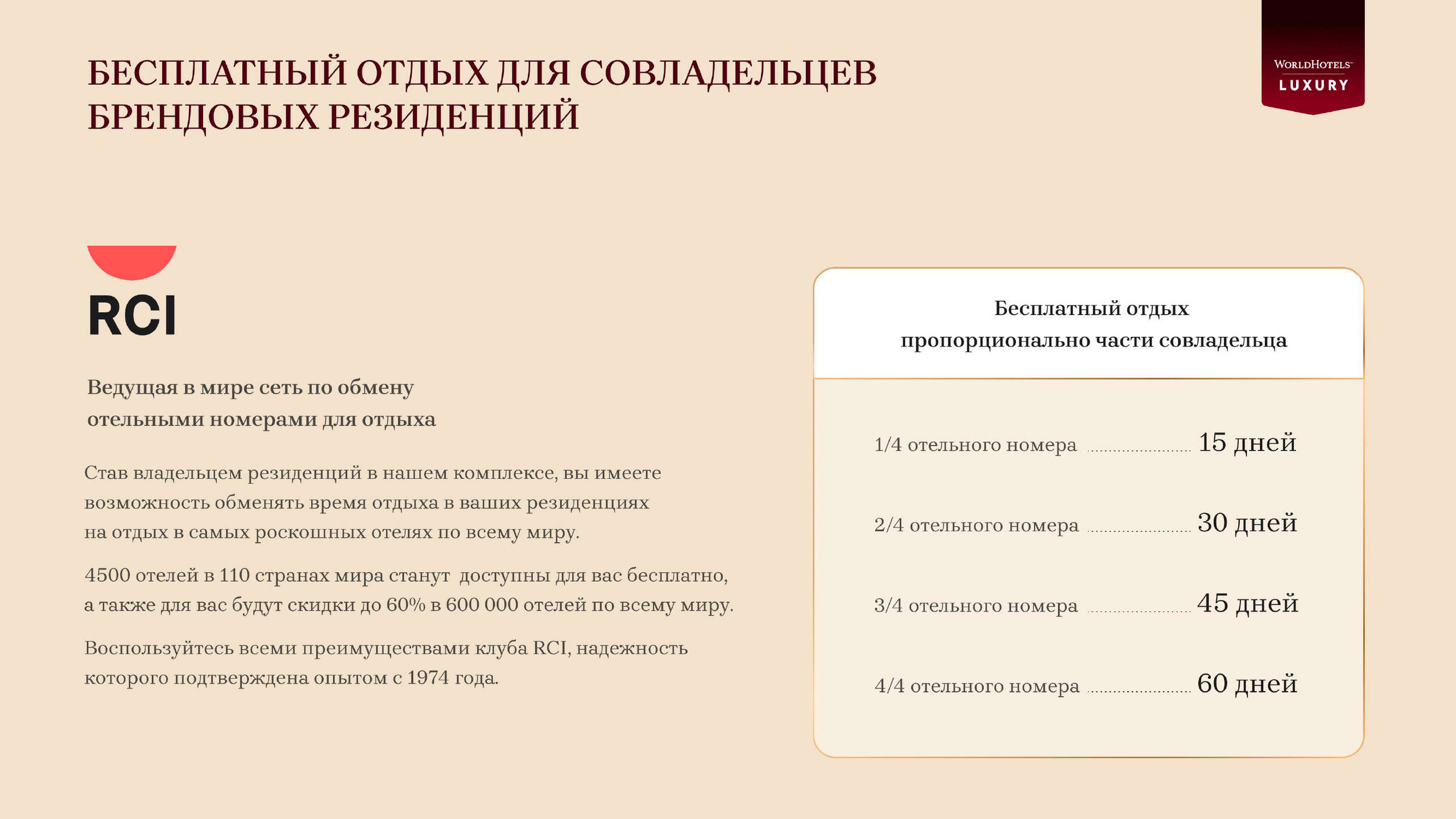 Дополнительный плюс: доход идёт в долларах США, а также собственник получает ** RCІ-обмен, Travel Club и бесплатные проживание в отелях WorldHotels** по программе лояльности.