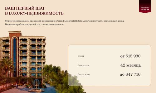 Grand Life — это не просто квартира у моря, а 5★ отельная резиденция под брендом WorldHotels Luxury от European Village. Вход в долларовый доход с управлением международным оператором, доступом к инфраструктуре Wyndham и понятной стратегией выхода из инвестиции.